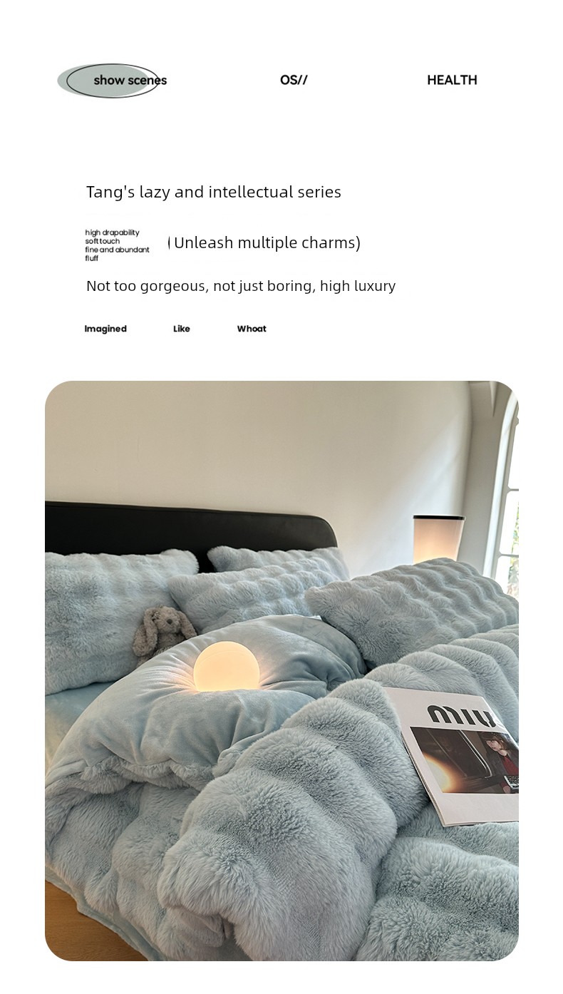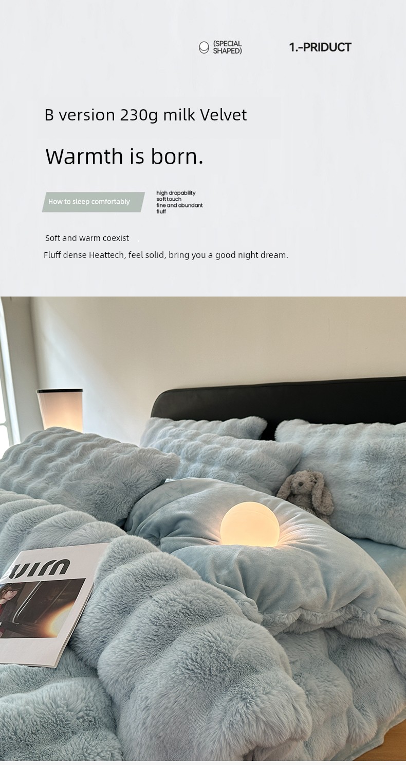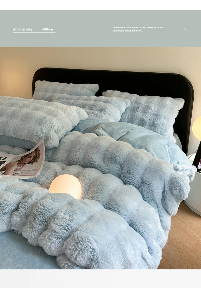 Cat-Like Rabbit Fur Plush Four-Piece Bedding Set for Winter, Thickened Milk Coral Fleece Bedding, Flannel Duvet Cover and Bed Sheet