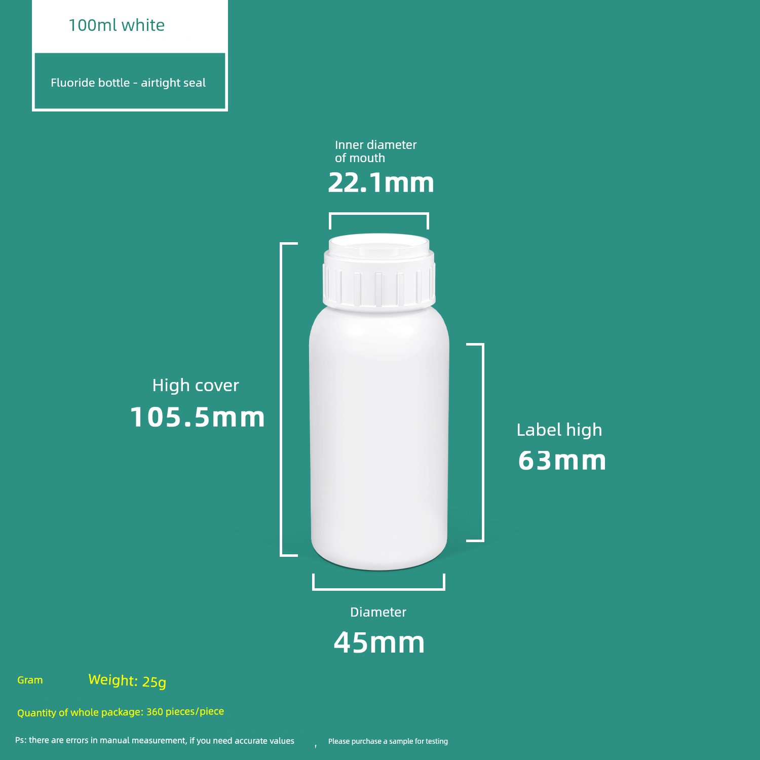 100ml Large Mouth Fluorine Bottle White - with Aluminum Foil Gasket (Pack of 2)