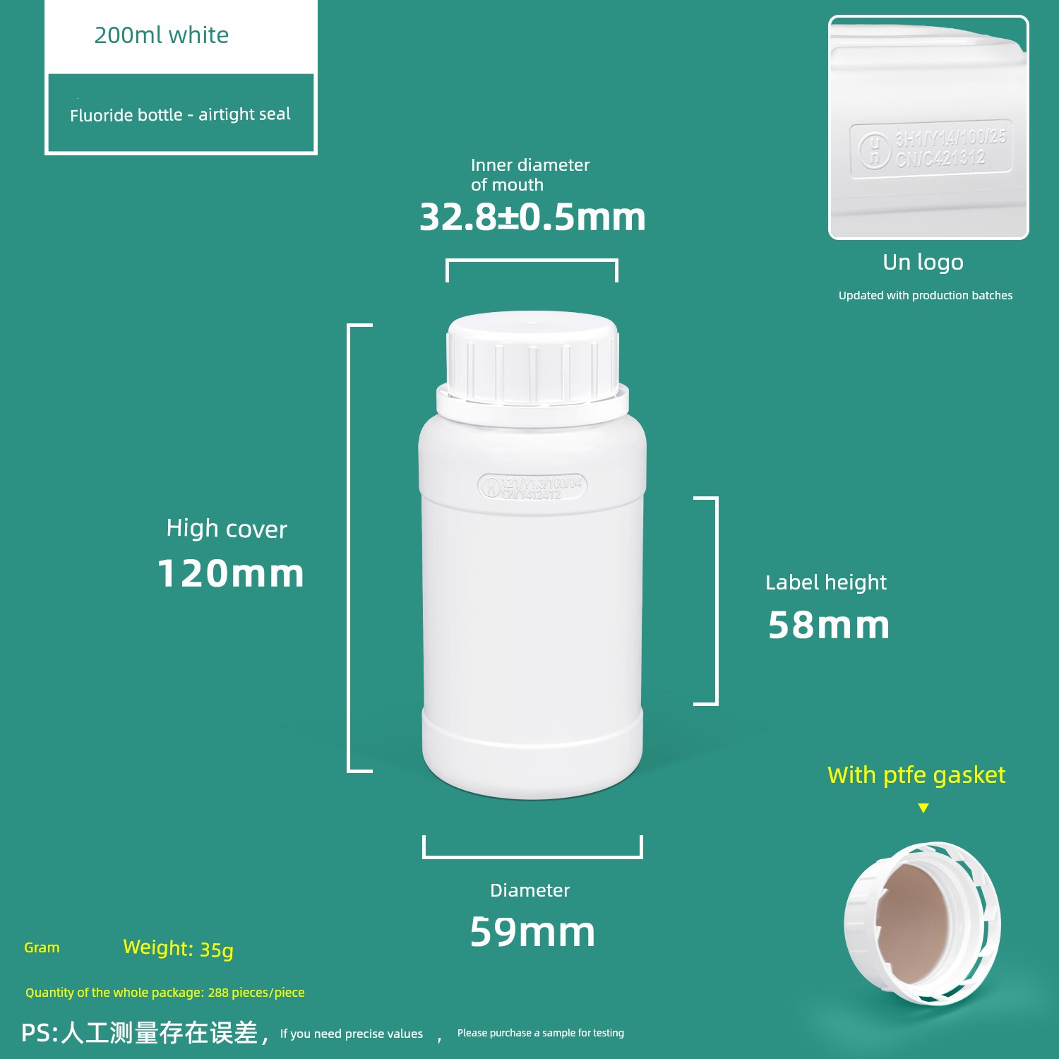 200ml Fluorinated Bottle White-With Ptfe Gasket