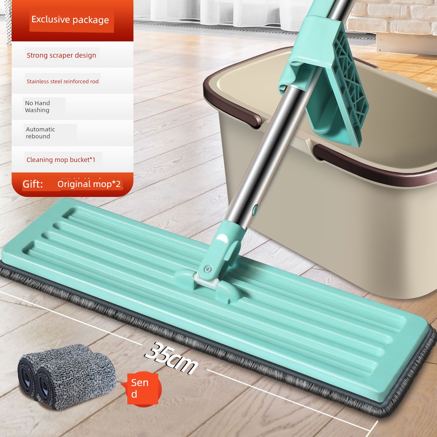 Set 2: Upgraded Flat Mop + 4 Mop Pads + Cleaning Bucket + 30 Cleaning Tablets