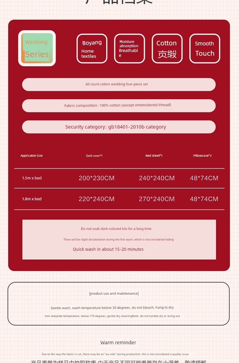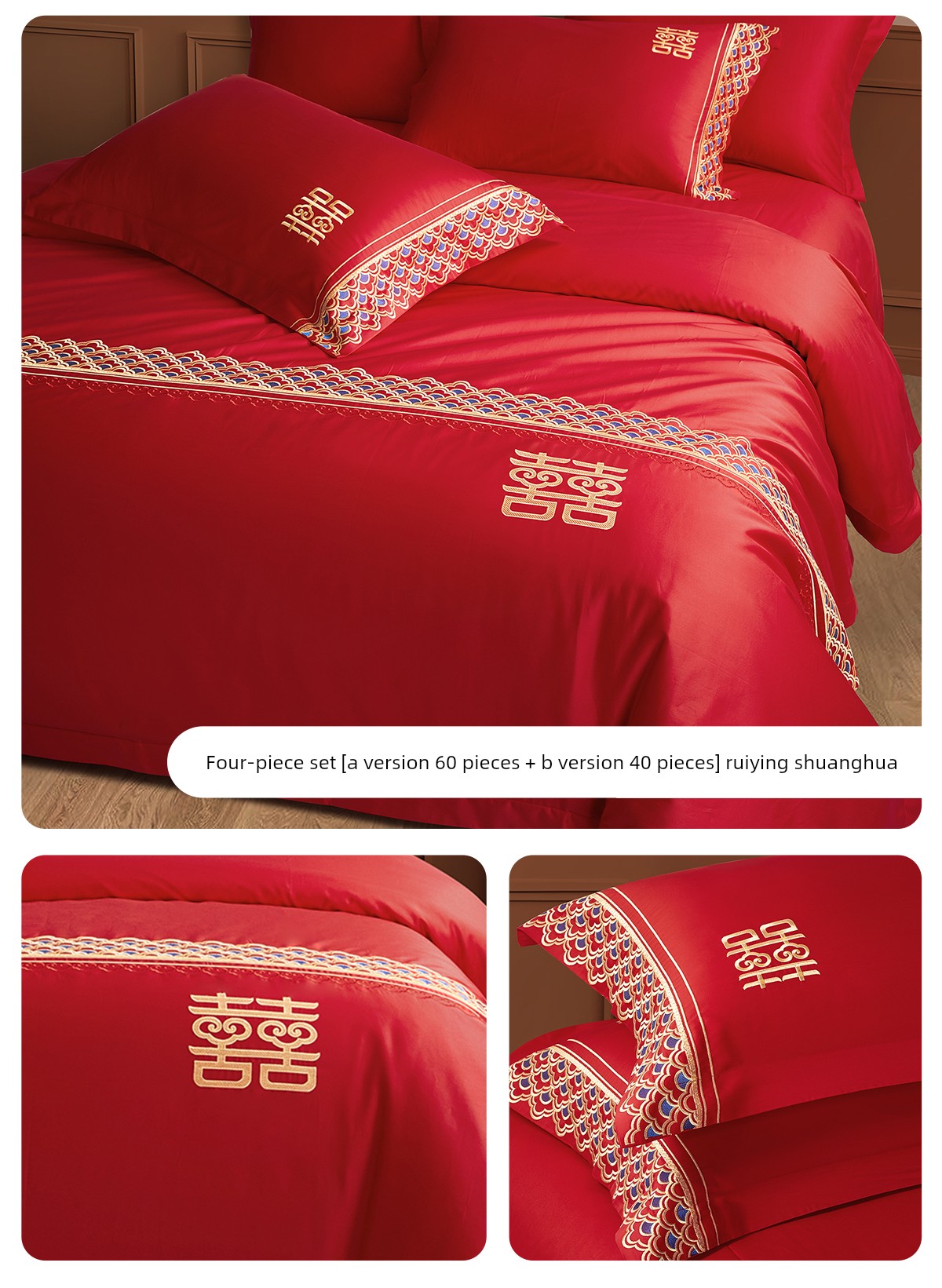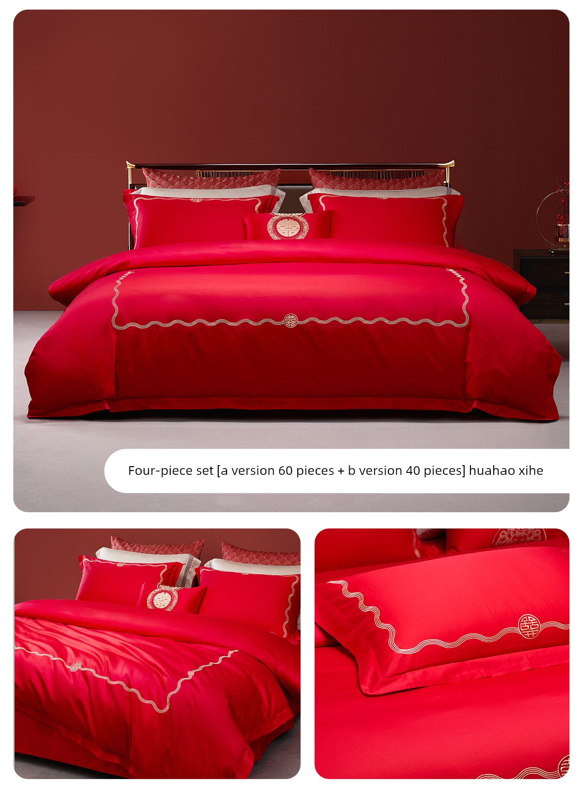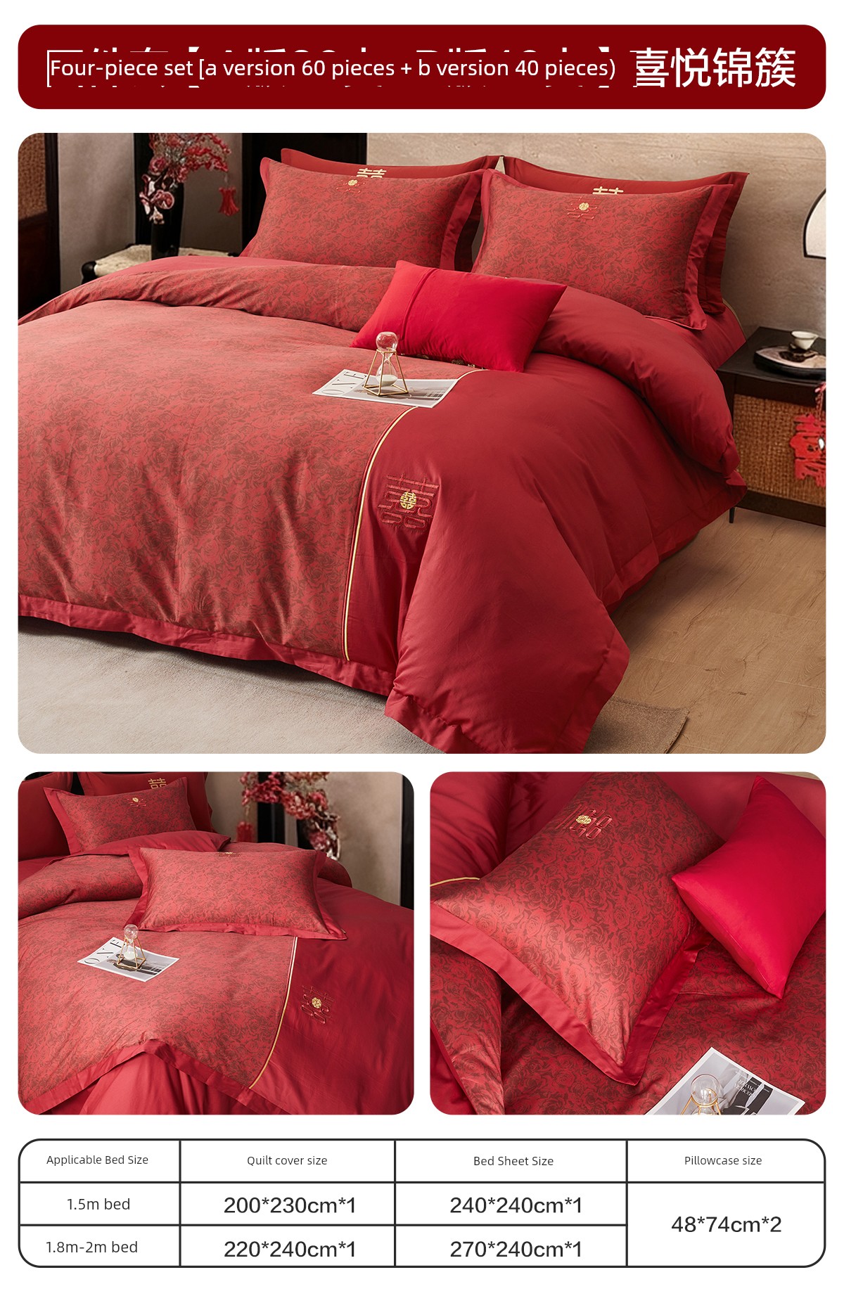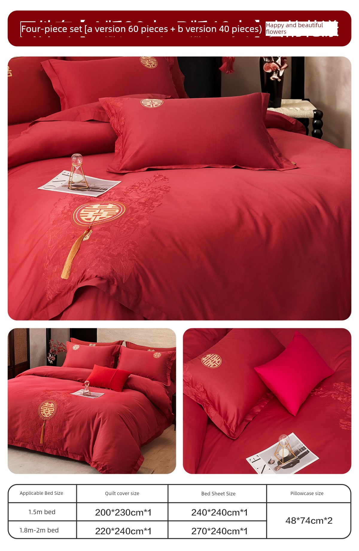 Boyang 60-Count Red Wedding Four-Piece Set, All-Cotton Bedding, Pure Cotton Wedding Quilt Cover, Festive