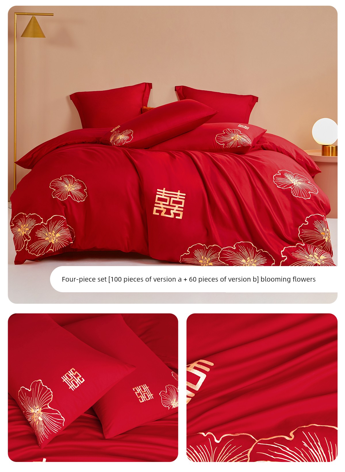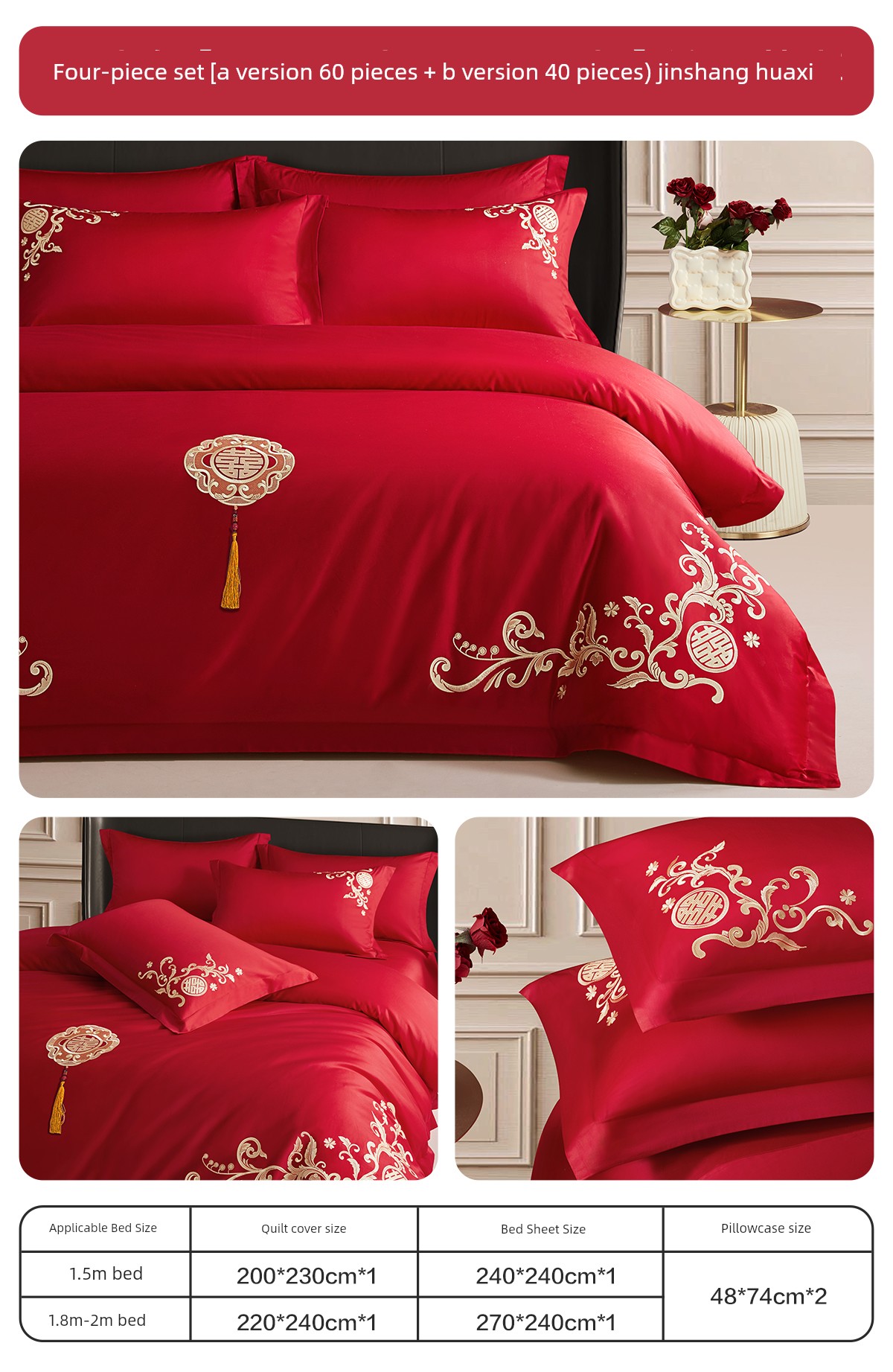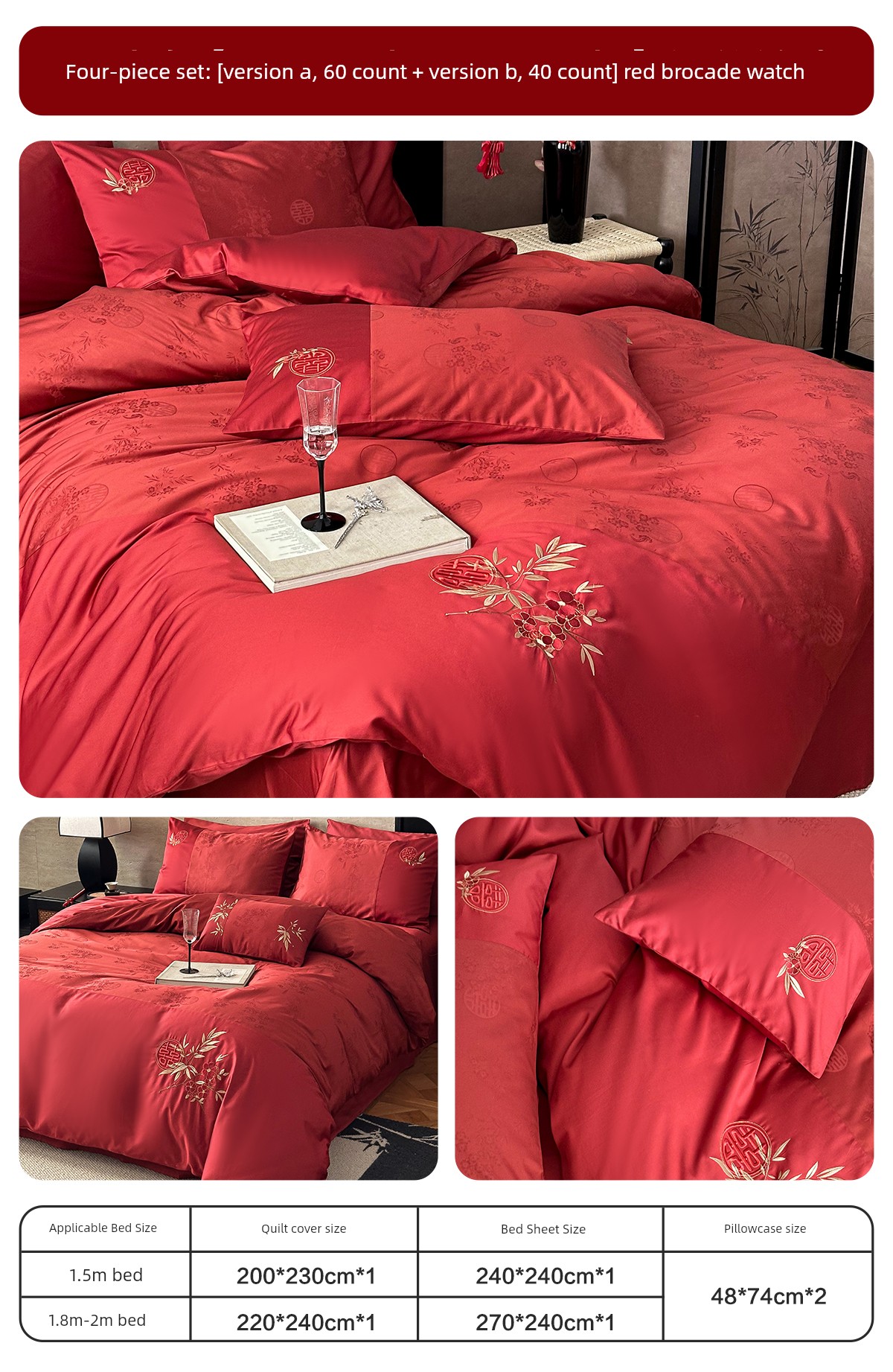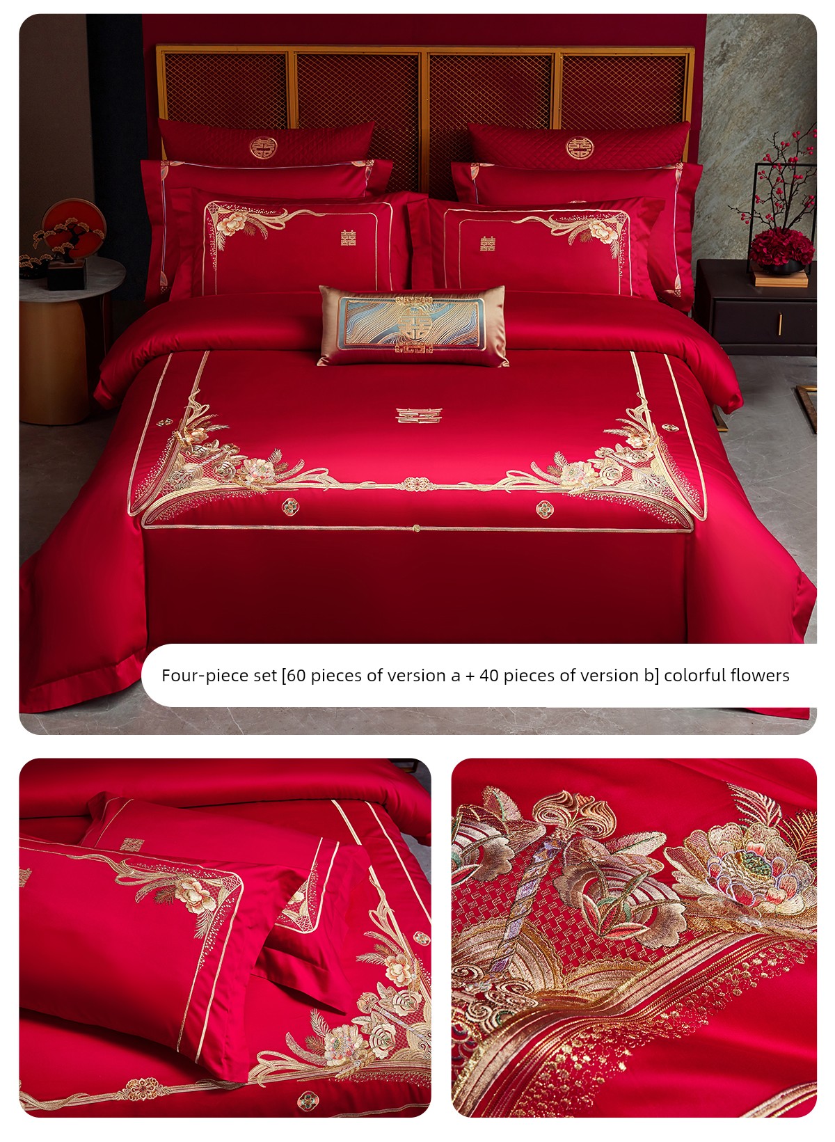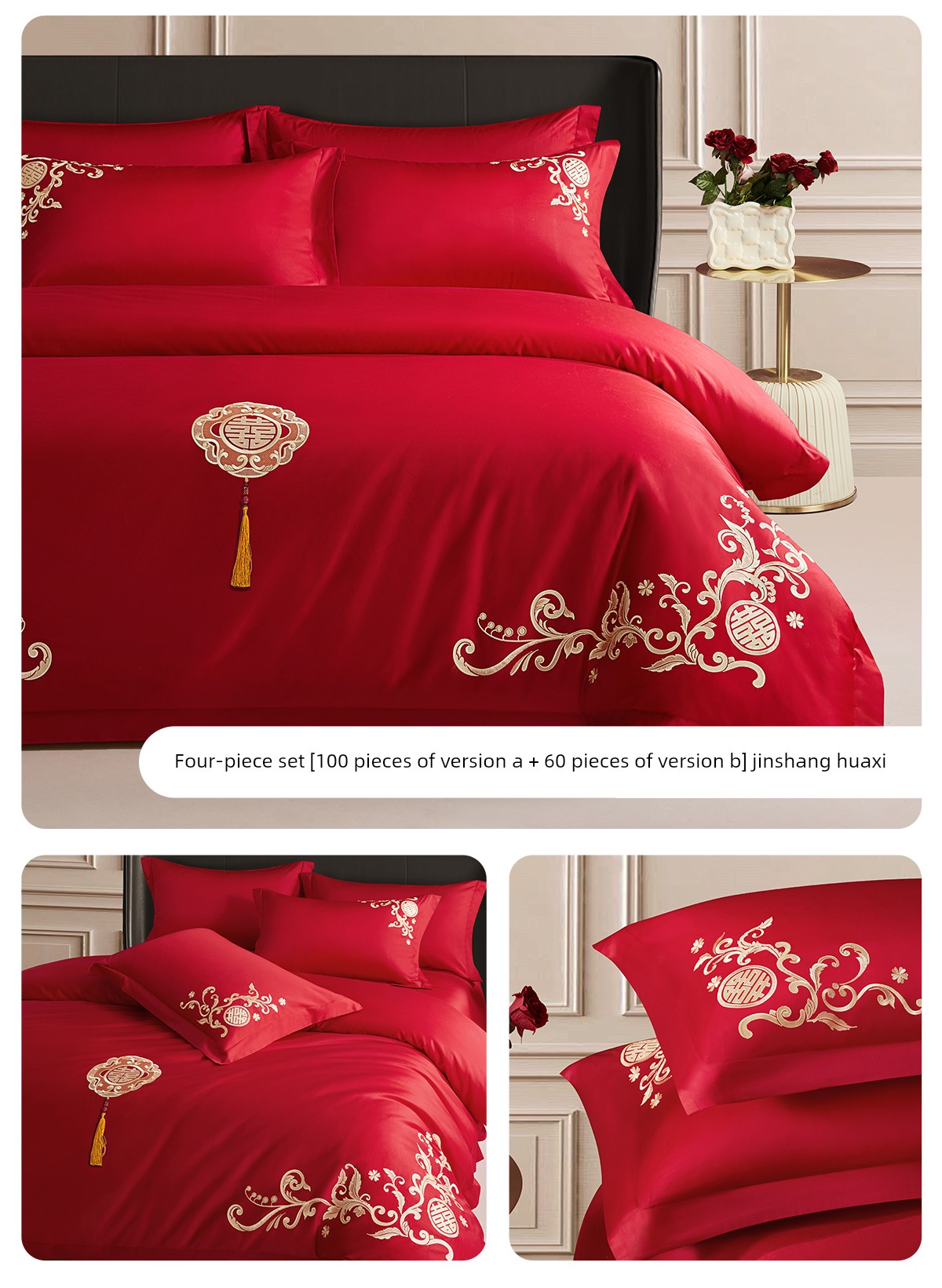 Boyang 60-Count Red Wedding Four-Piece Set, All-Cotton Bedding, Pure Cotton Wedding Quilt Cover, Festive