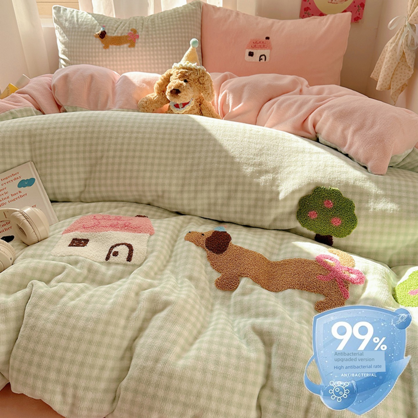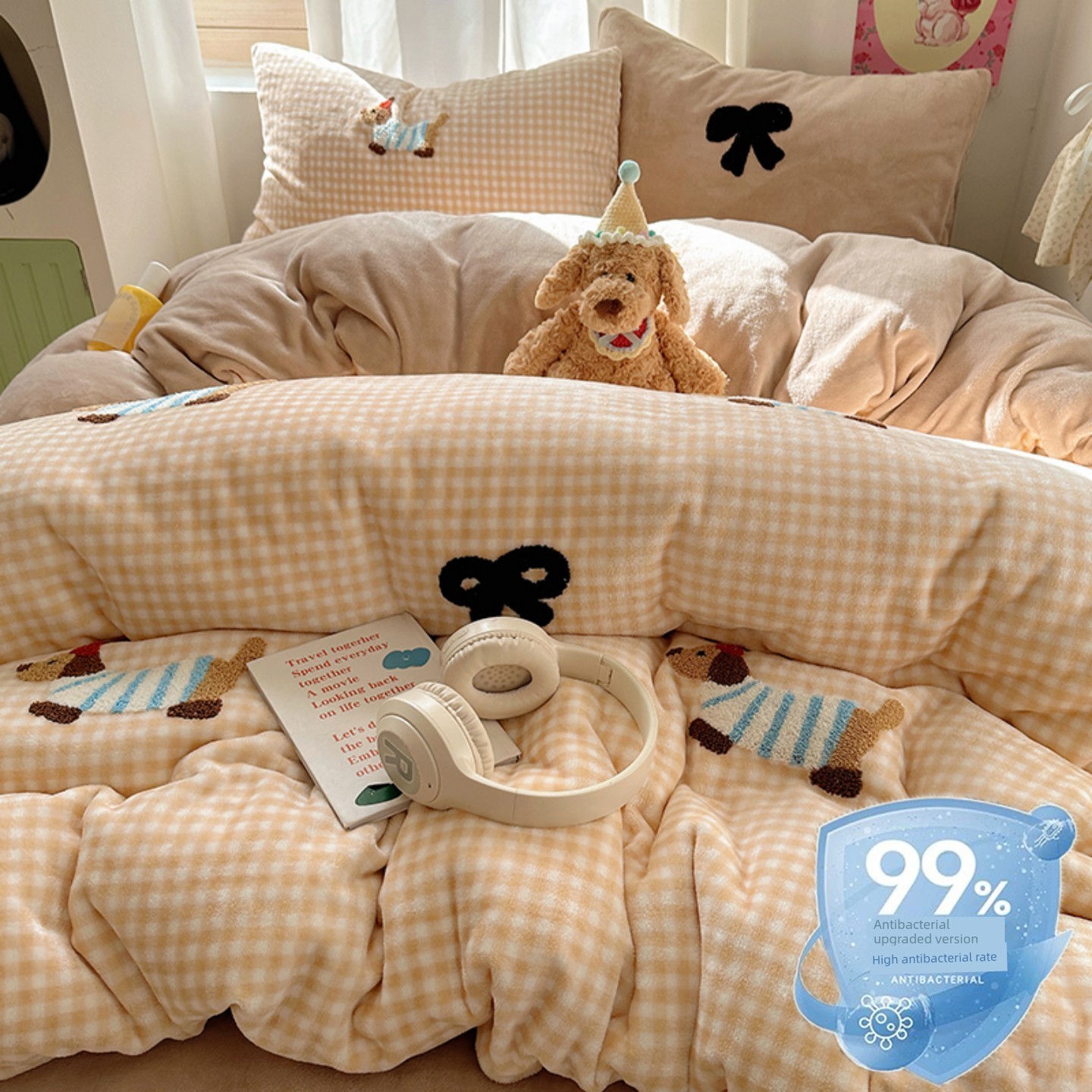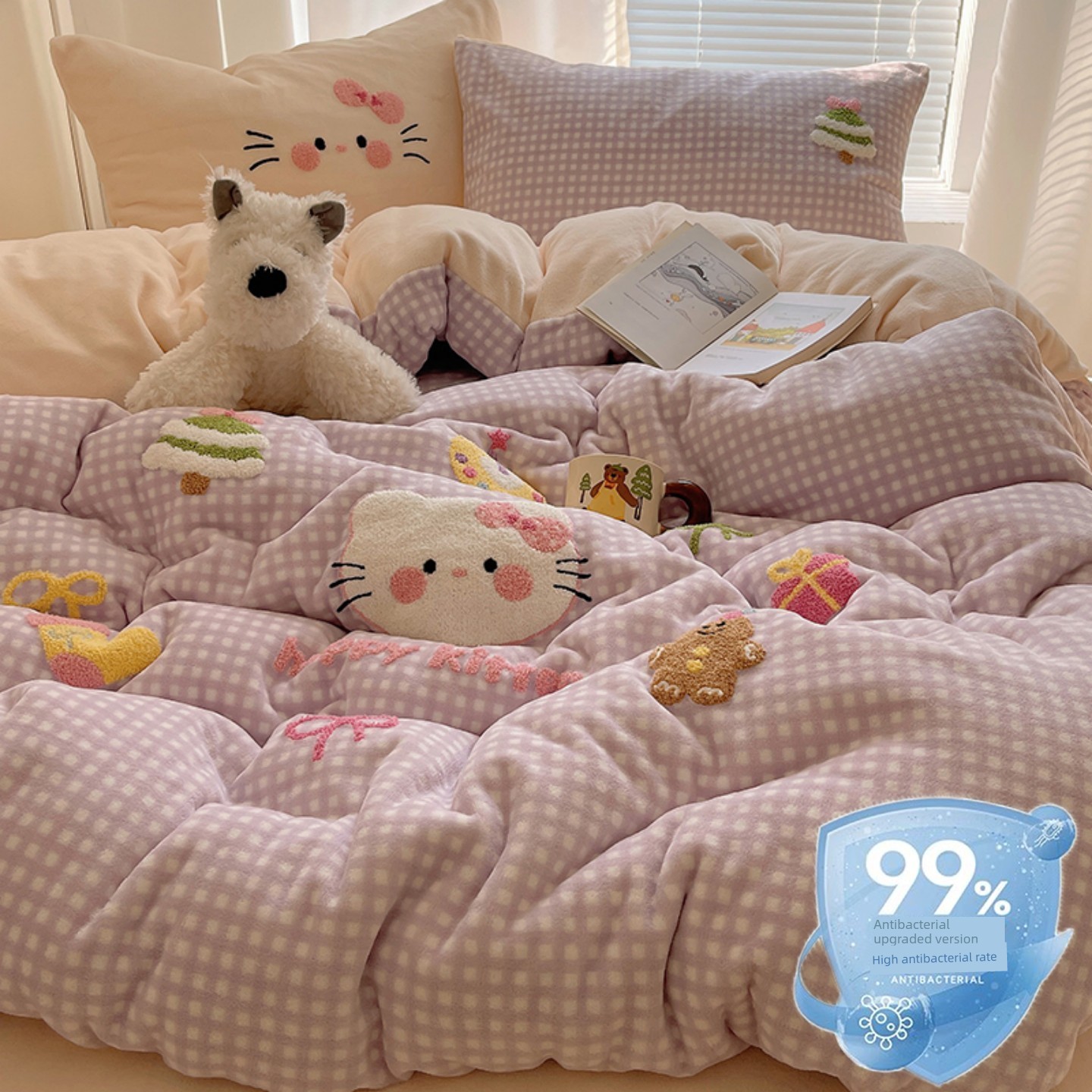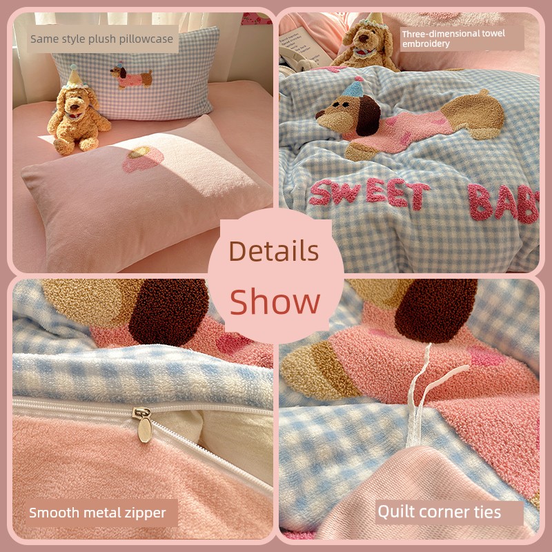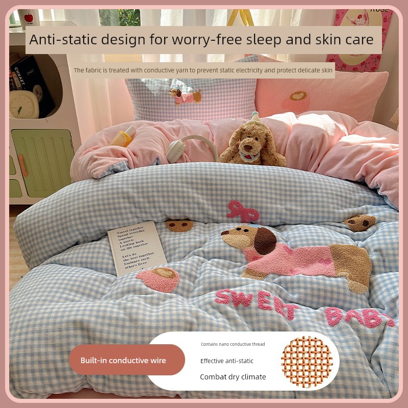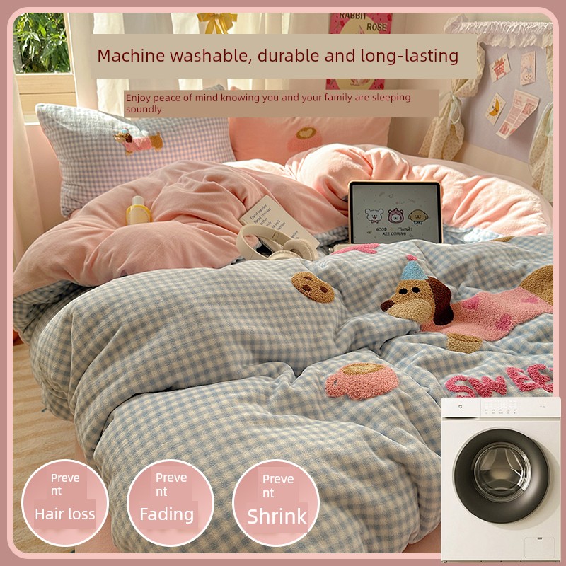 Baby Milk Velvet Four-Piece Bedding Set, Thickened Coral Fleece Towel Embroidered Duvet Cover, Three-Piece Winter Set