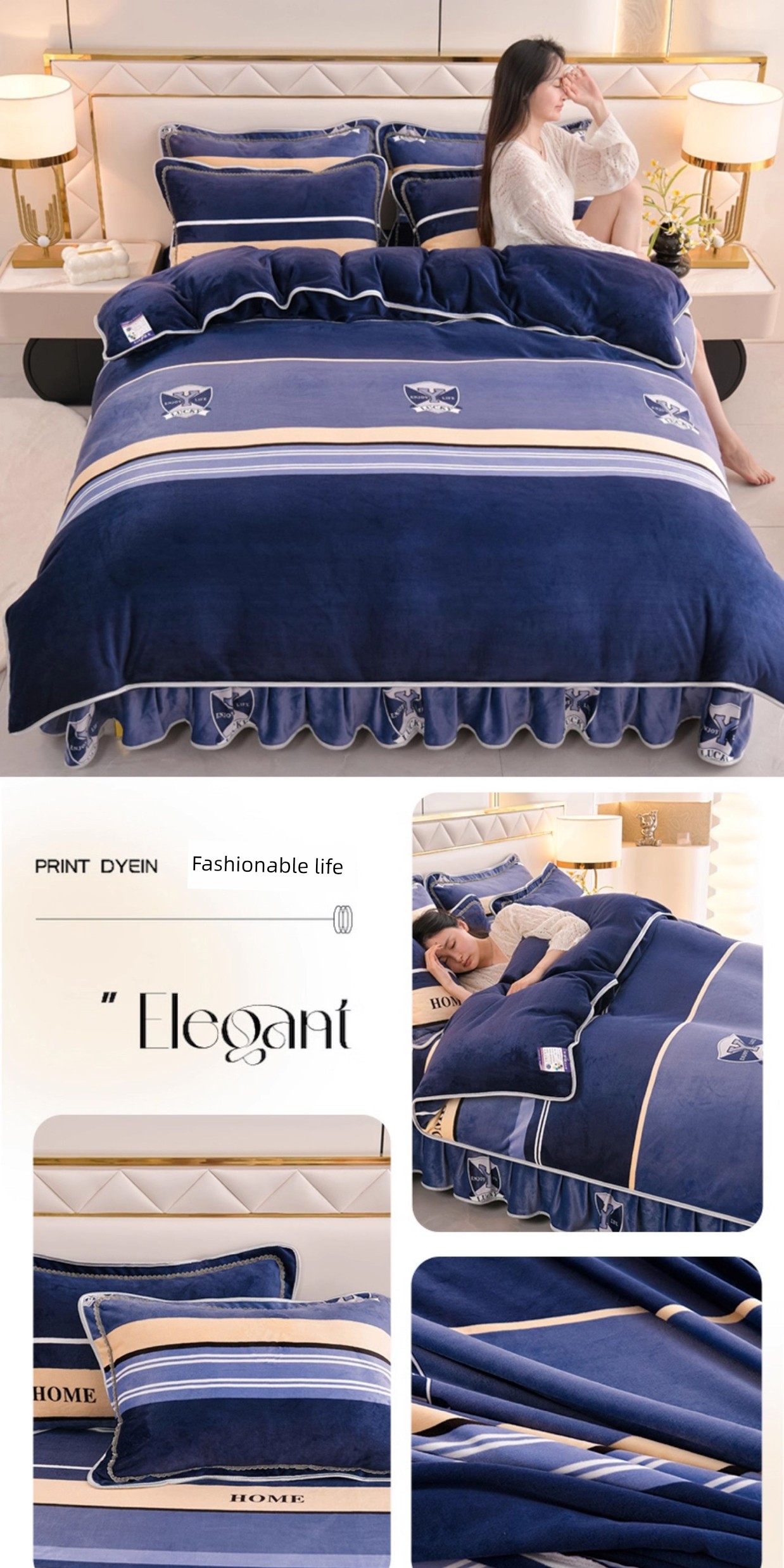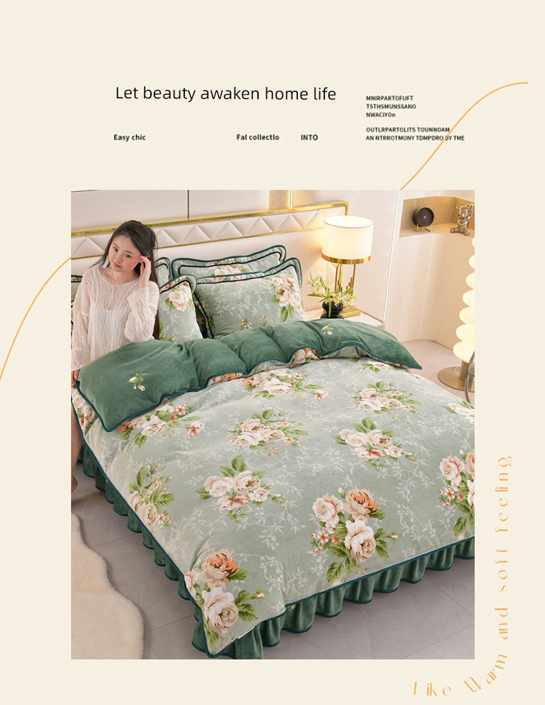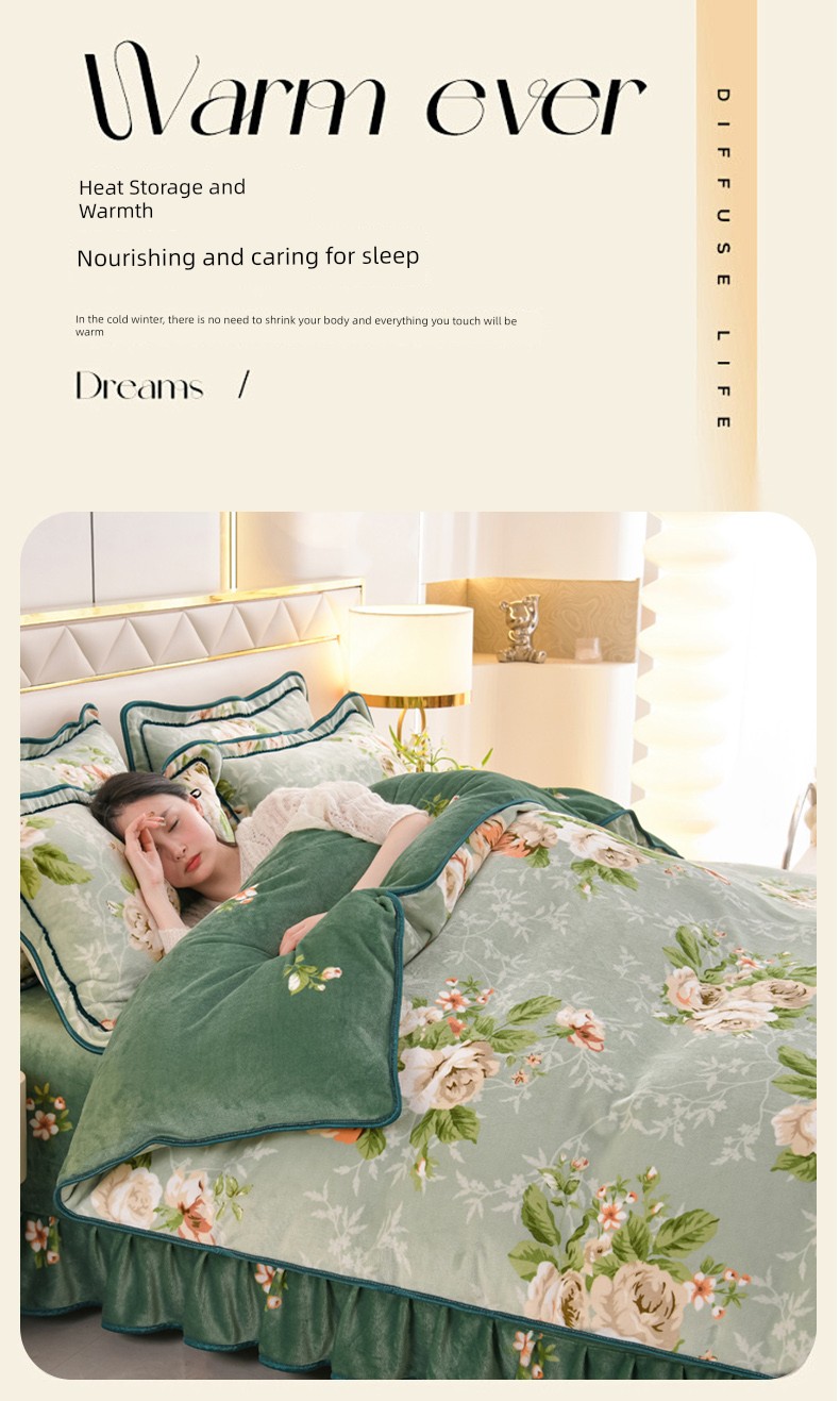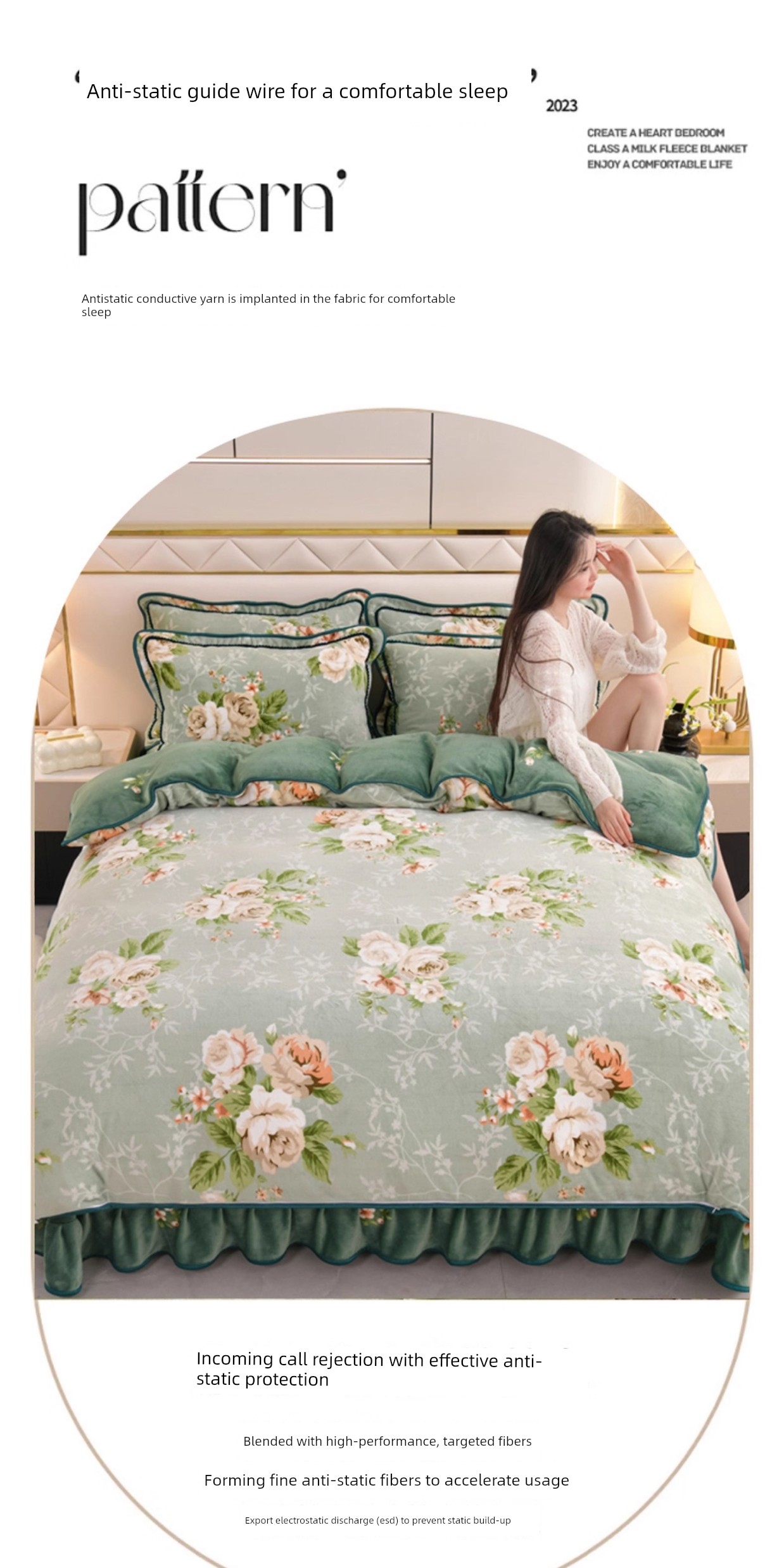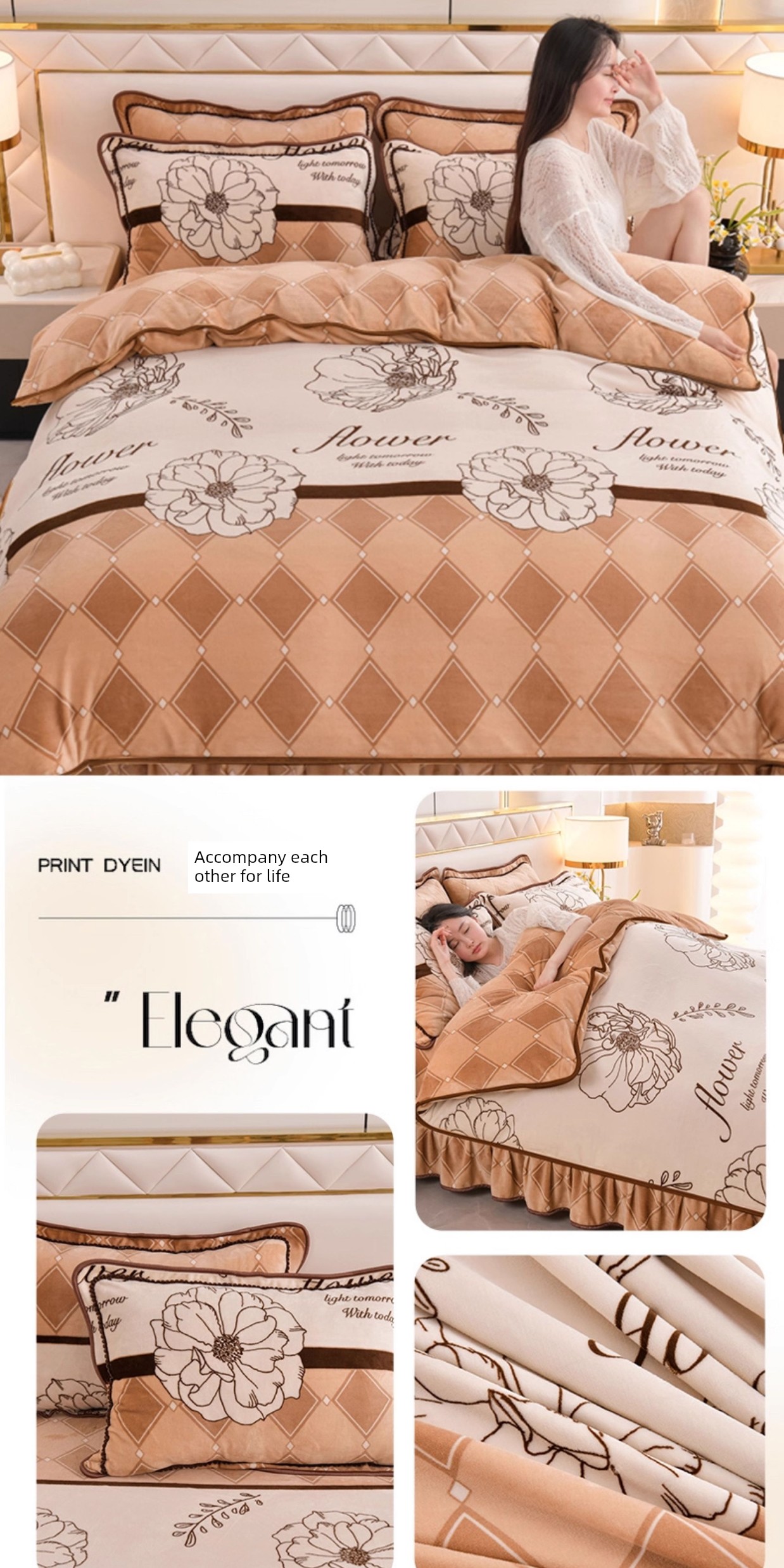 Fleece-Lined Milk Velvet Four-Piece Set, Double-Sided Thickened Coral Fleece Duvet Cover, Flannel Bed Sheet, Bed Skirt, Winter Bedding
