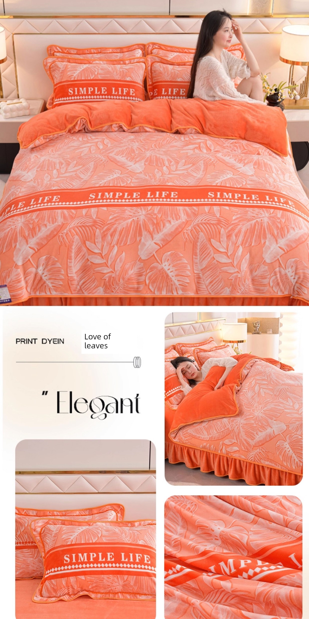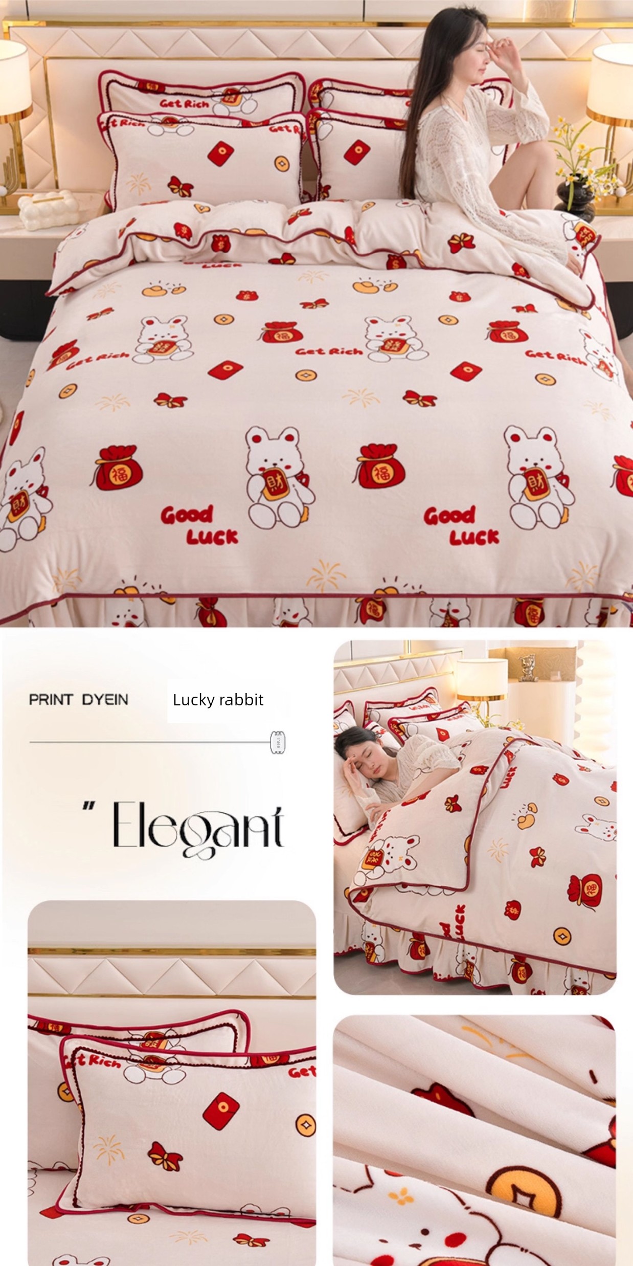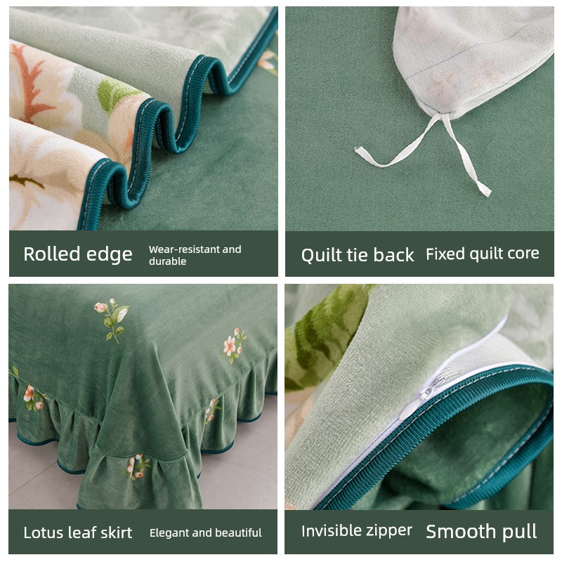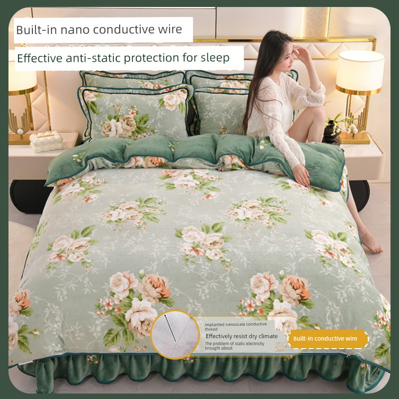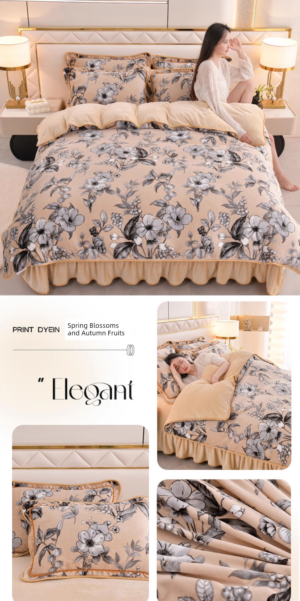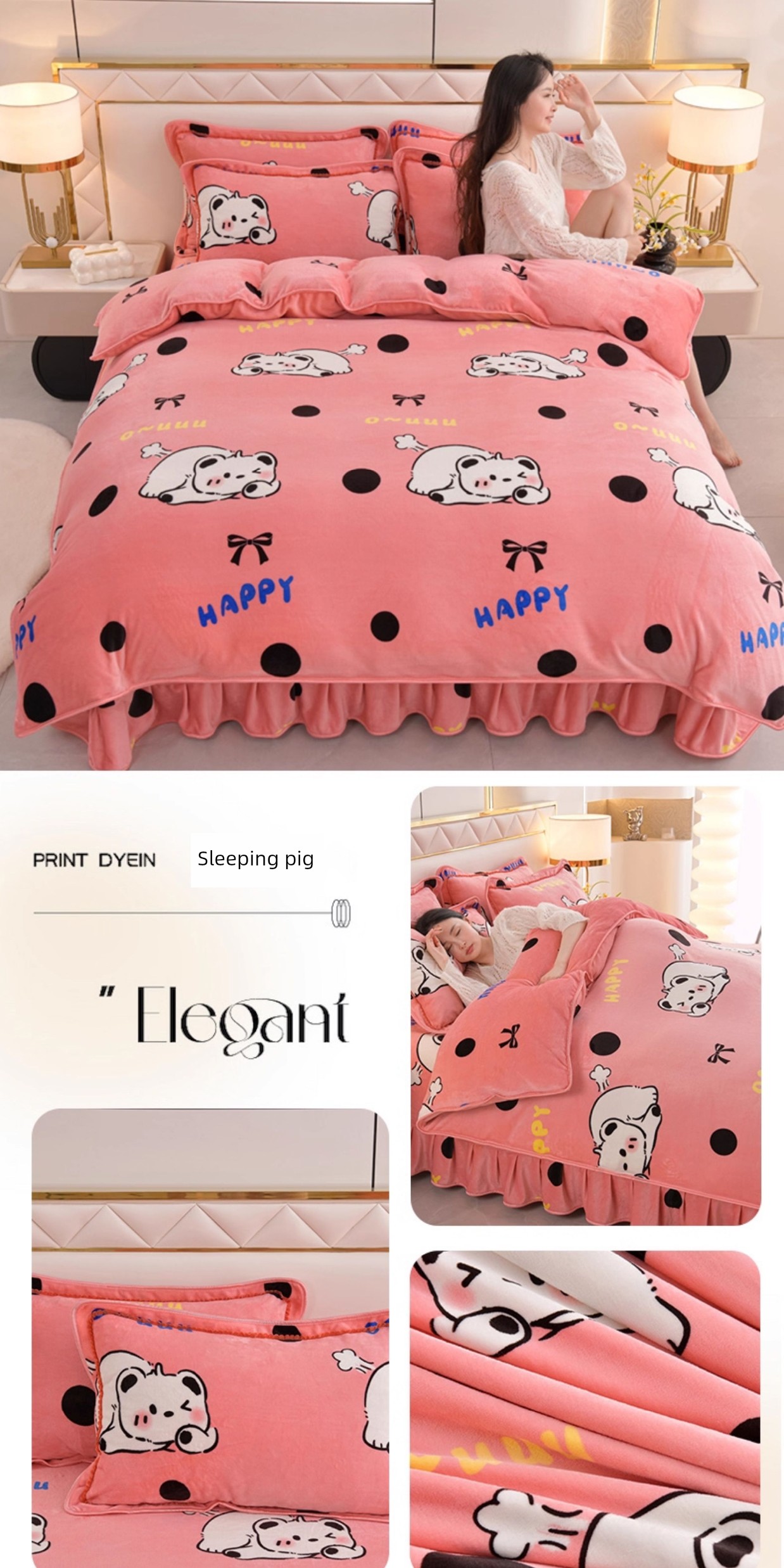 Fleece-Lined Milk Velvet Four-Piece Set, Double-Sided Thickened Coral Fleece Duvet Cover, Flannel Bed Sheet, Bed Skirt, Winter Bedding