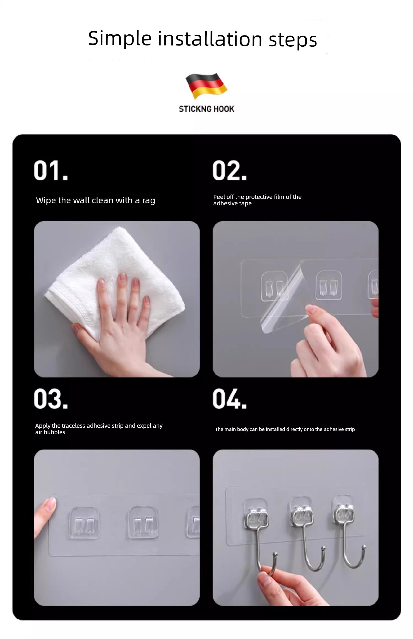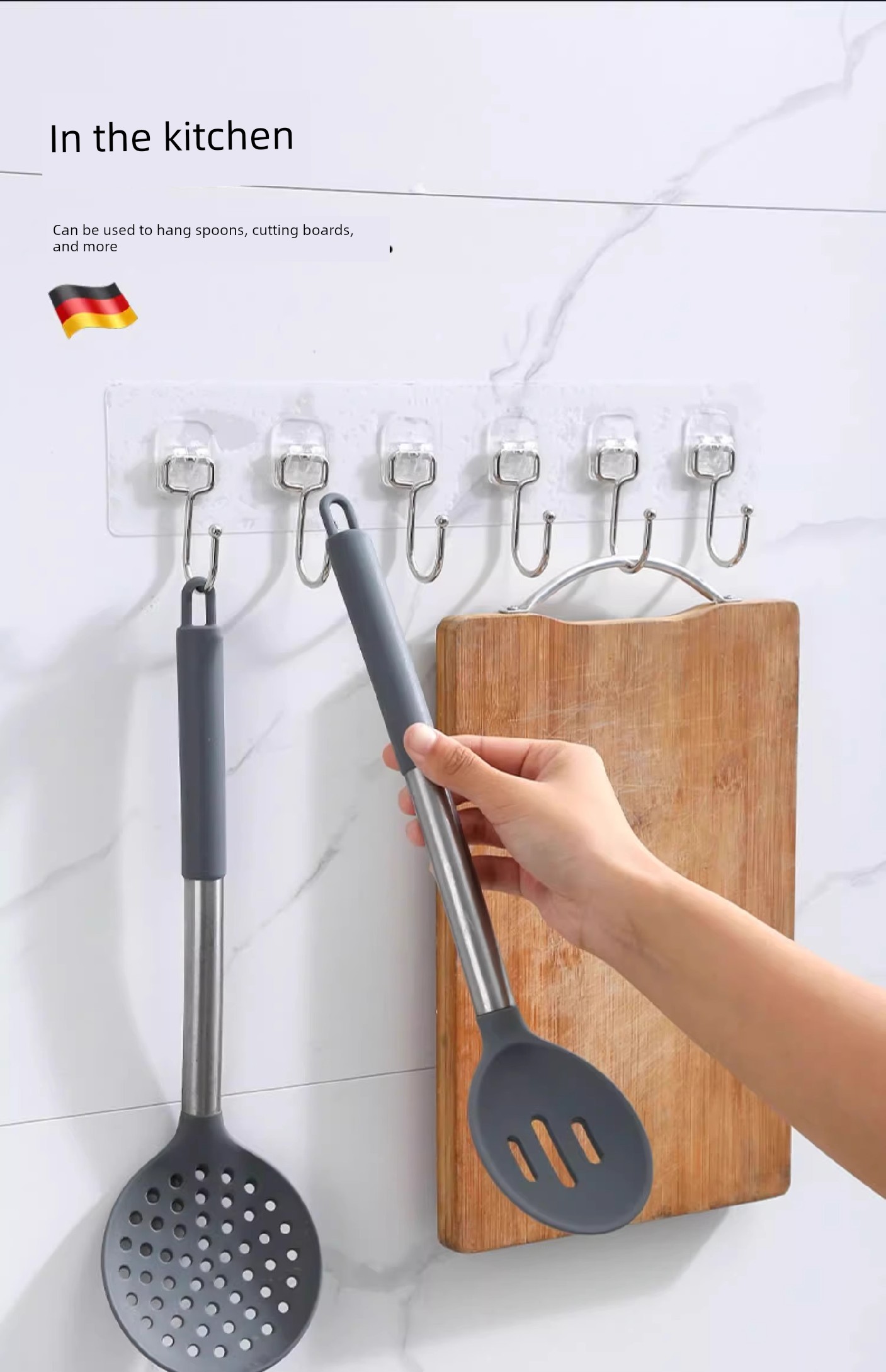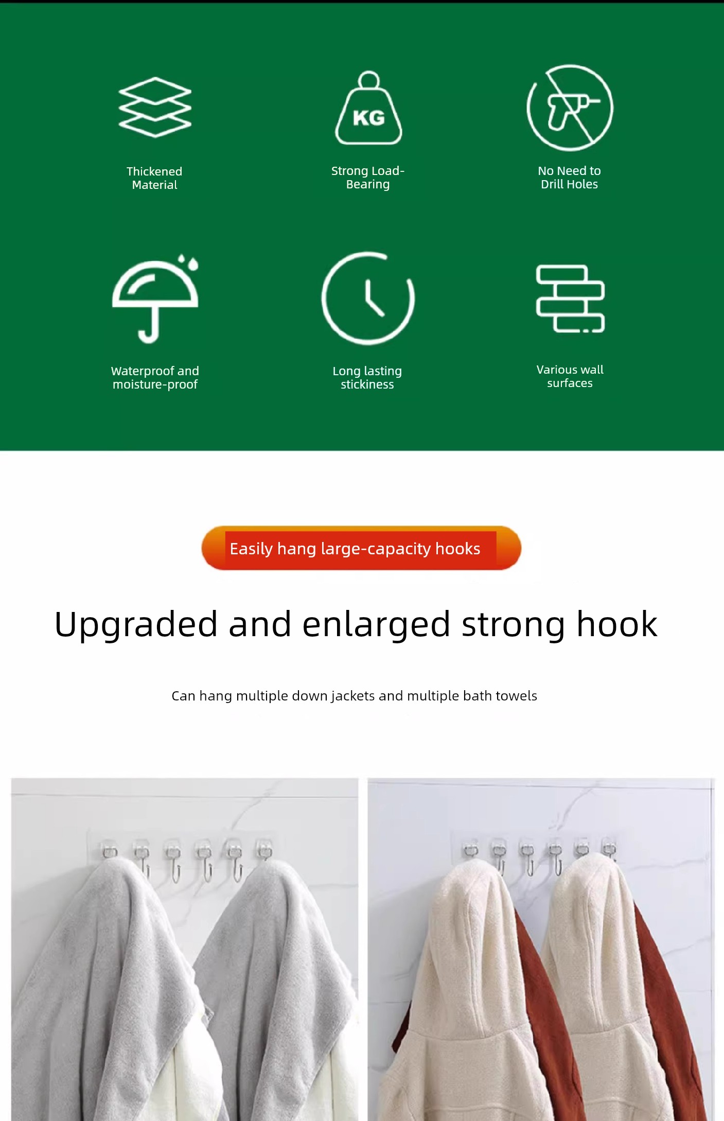 No-Drill Hooks for Kitchen Walls, Behind Doors, Clothes Hangers, Adhesive Hooks, Strong Adhesive, Bathroom, Row of Hooks, Traceless Hooks