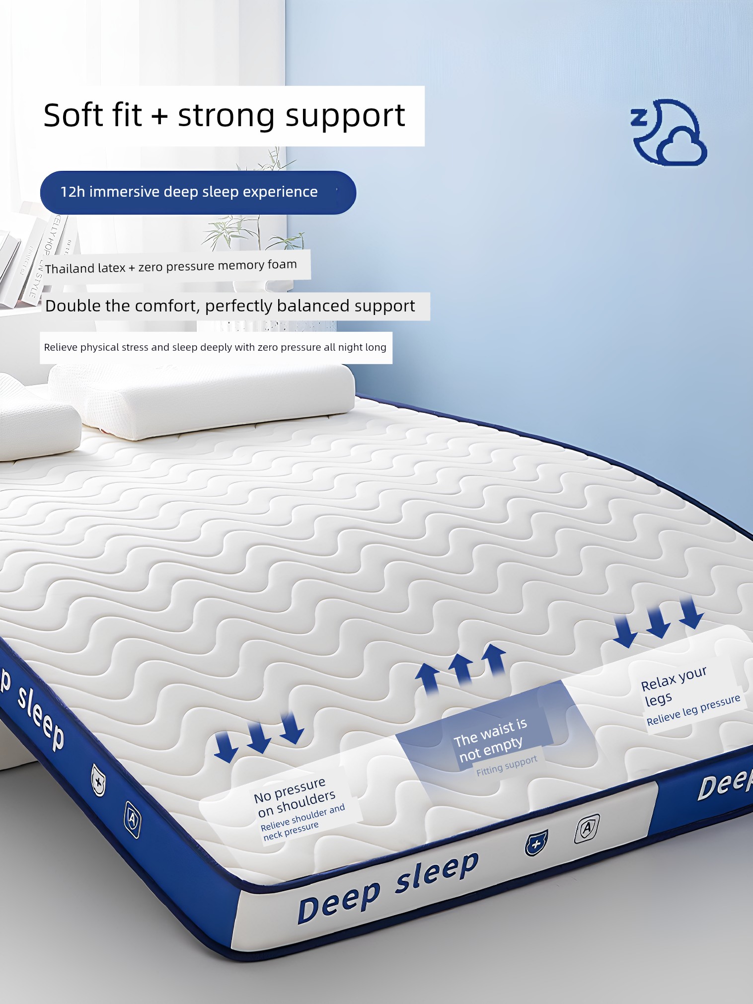 [Deep Sleep 3.0] Three-Dimensional Solid Color Deep-White and Blue/About 9cm Thick [Real Natural Latex/Memory Foam Neck Protection Layer Imported from Thailand]