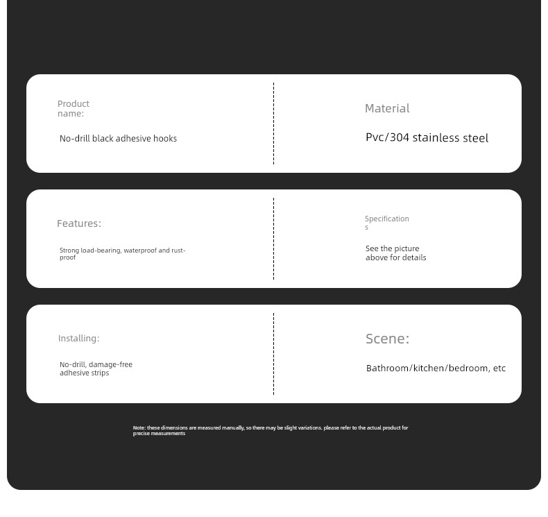 [Pack of 50] Increase Size|Strong Adhesive Brushed Black + Stainless Steel Solid Large Hook