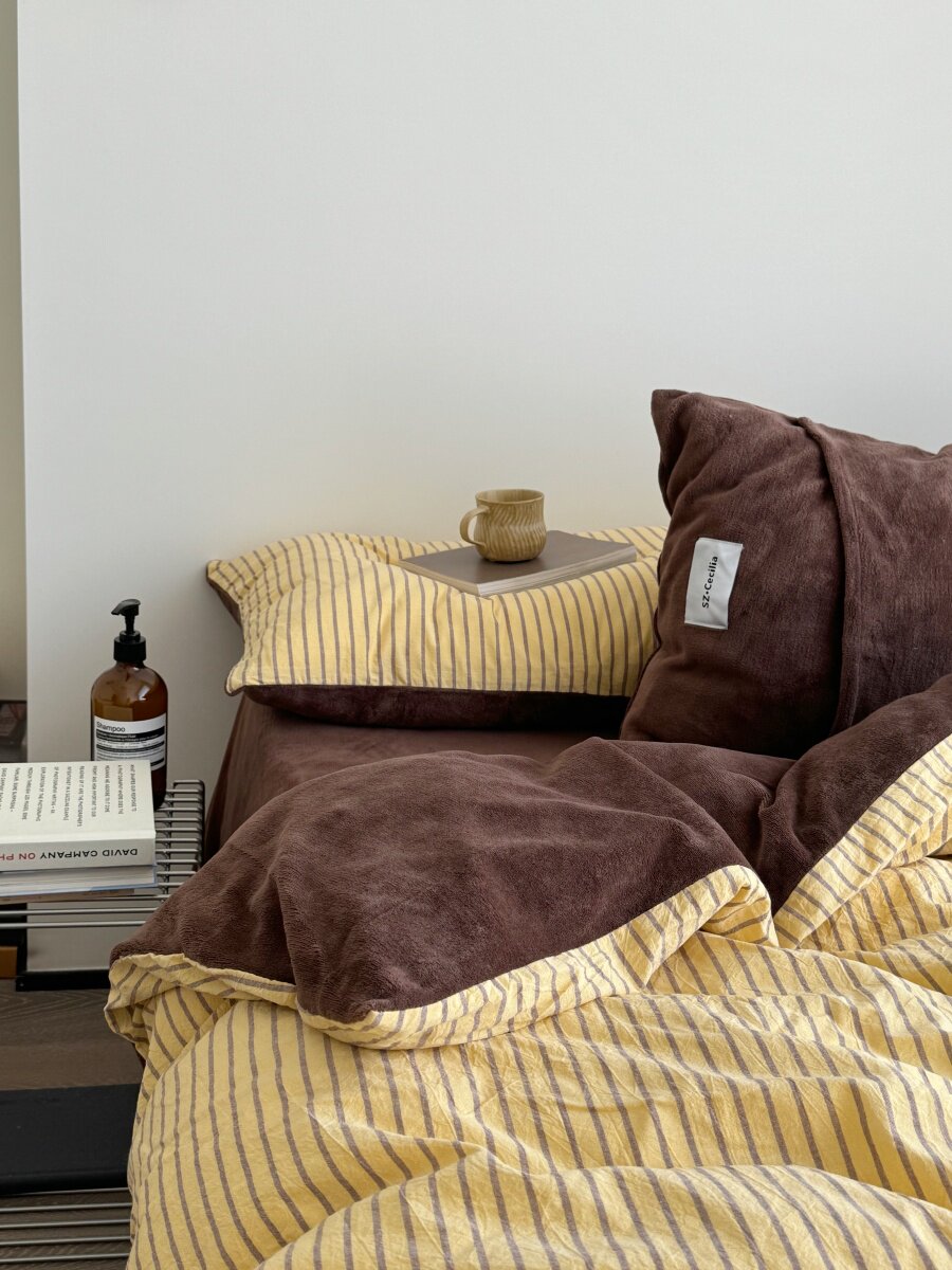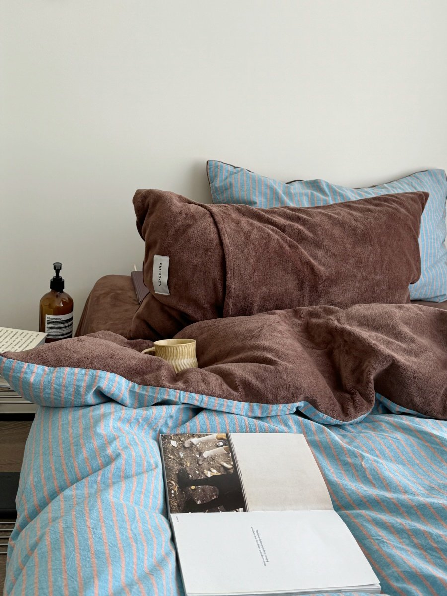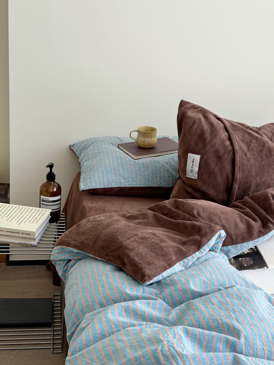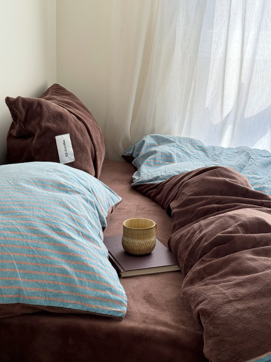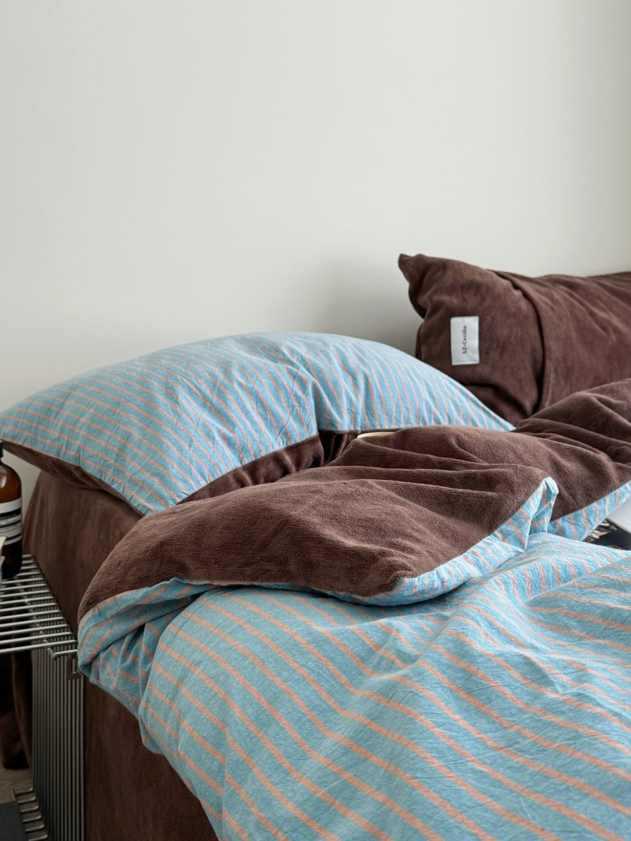 Retro Room|Ins Blogger Simple Blue and Coffee Color Striped Cotton Fleece Four-Piece Set 1.8 Milk Velvet Bed Sheet Fitted Sheet