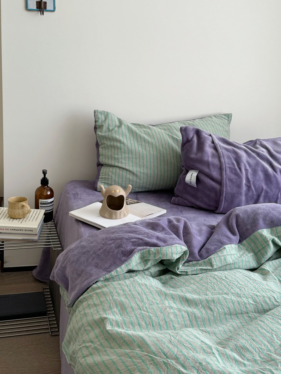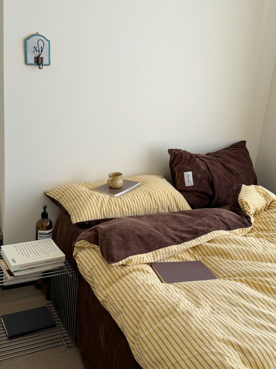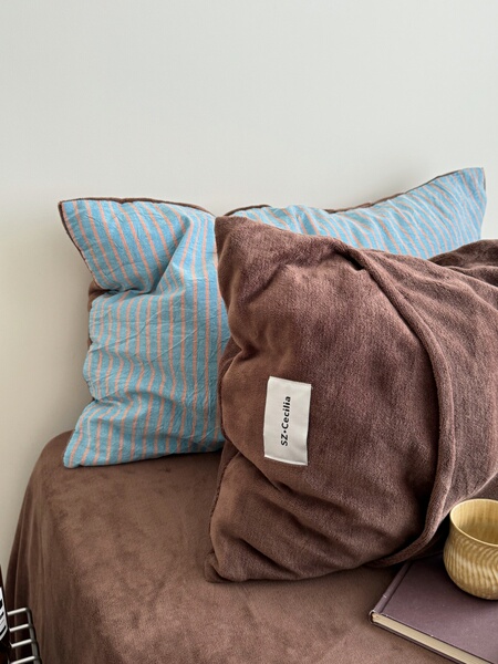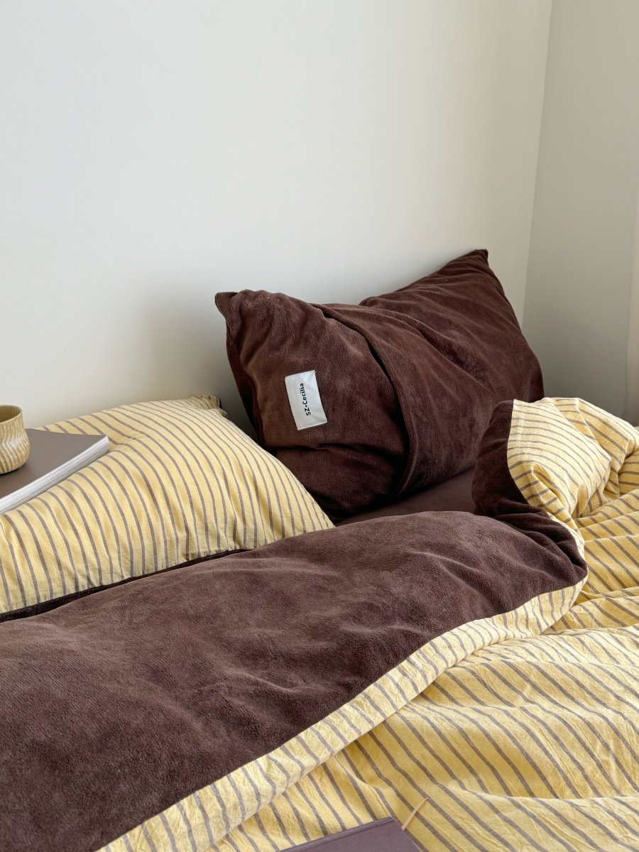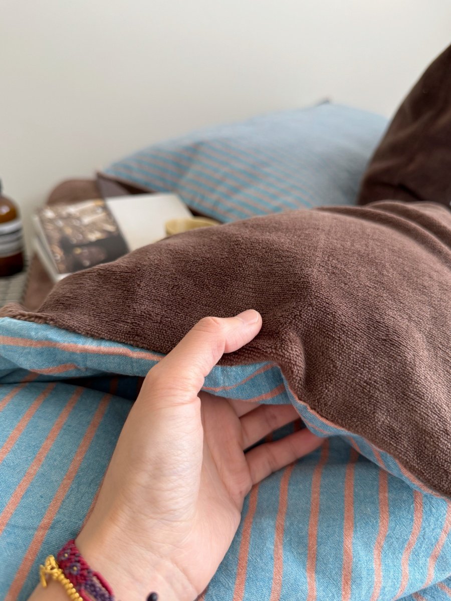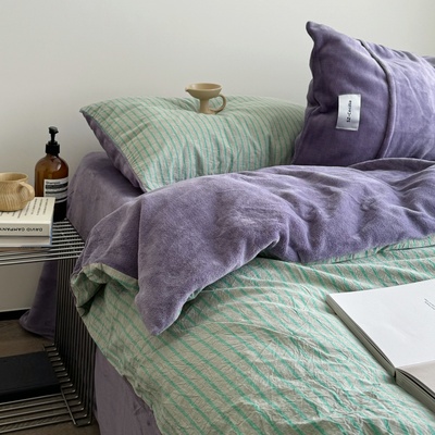 Retro Room|Ins Blogger Simple Blue and Coffee Color Striped Cotton Fleece Four-Piece Set 1.8 Milk Velvet Bed Sheet Fitted Sheet