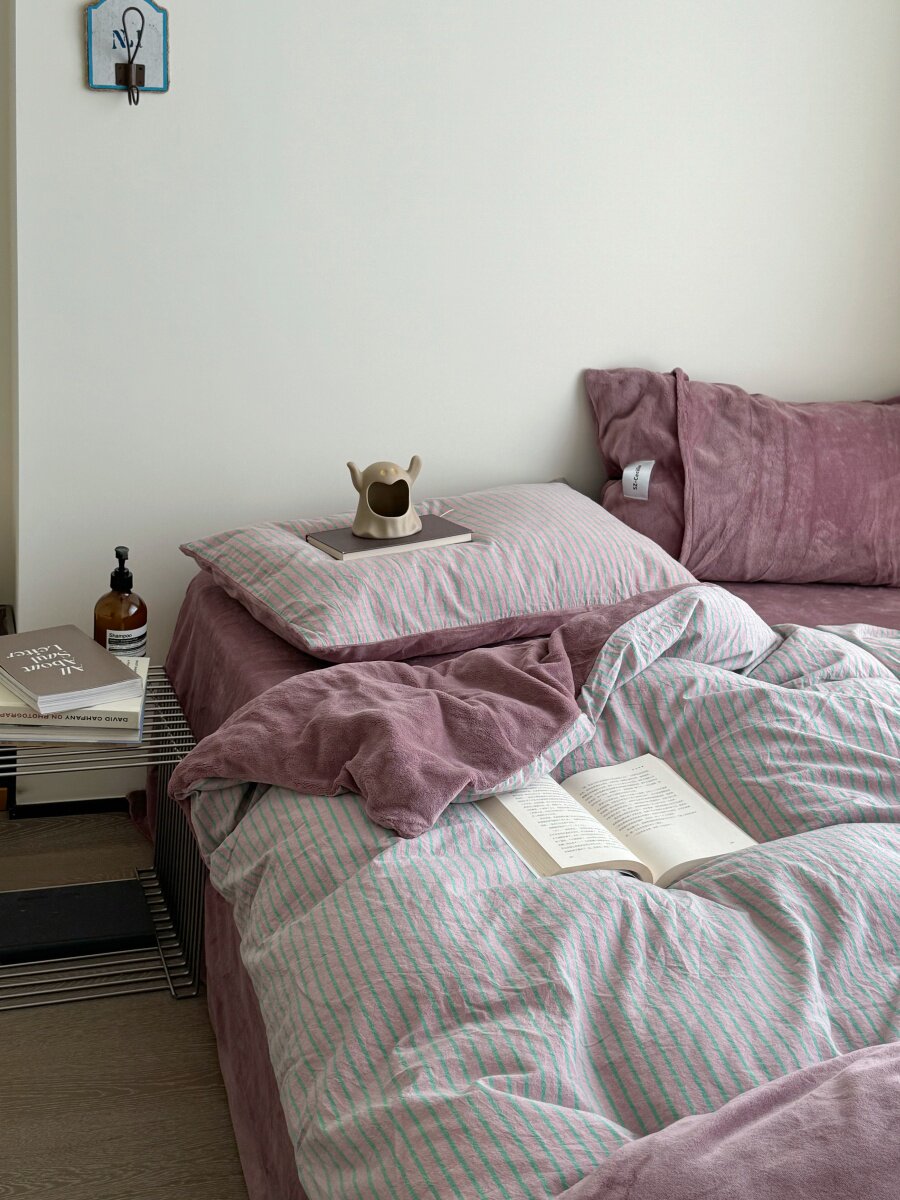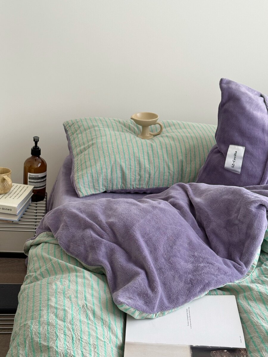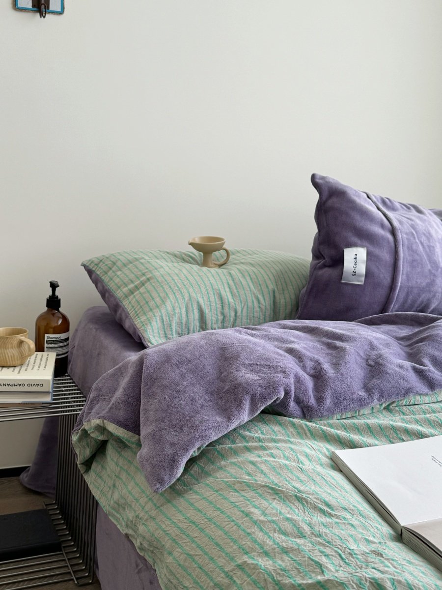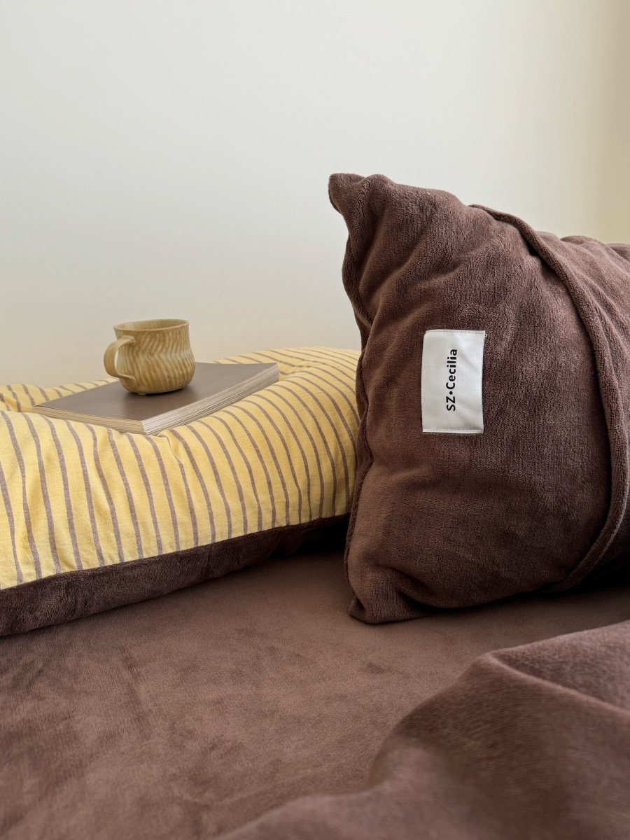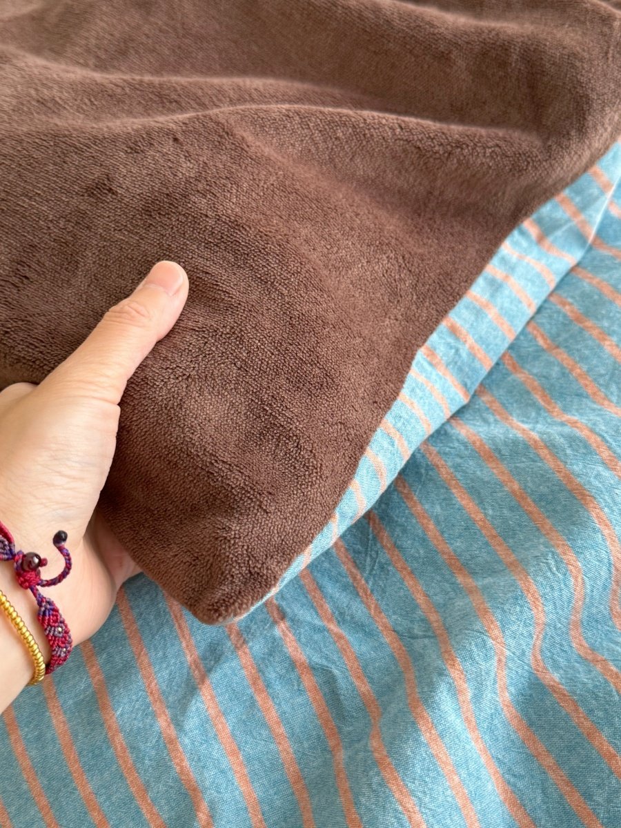 Retro Room|Ins Blogger Simple Blue and Coffee Color Striped Cotton Fleece Four-Piece Set 1.8 Milk Velvet Bed Sheet Fitted Sheet