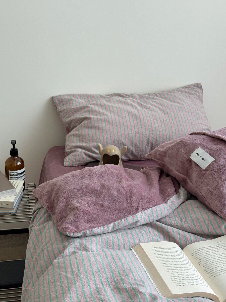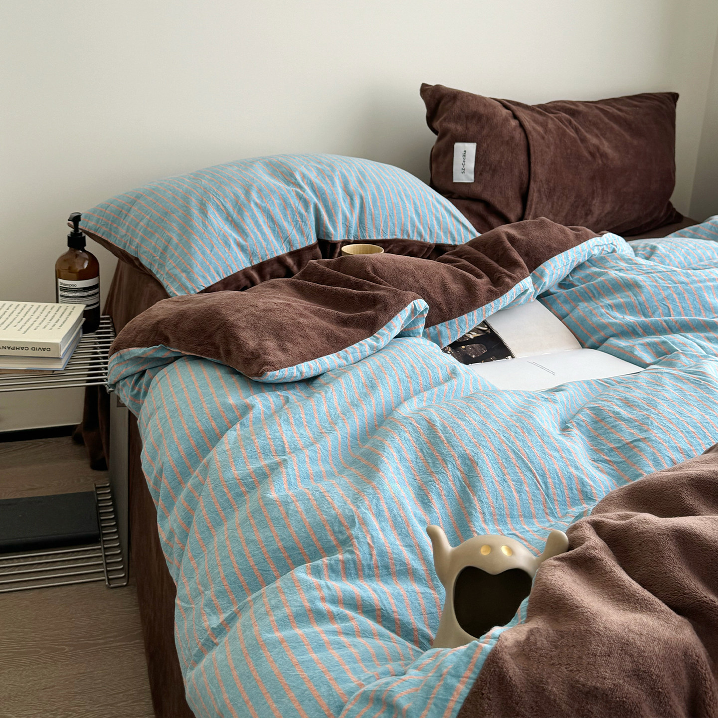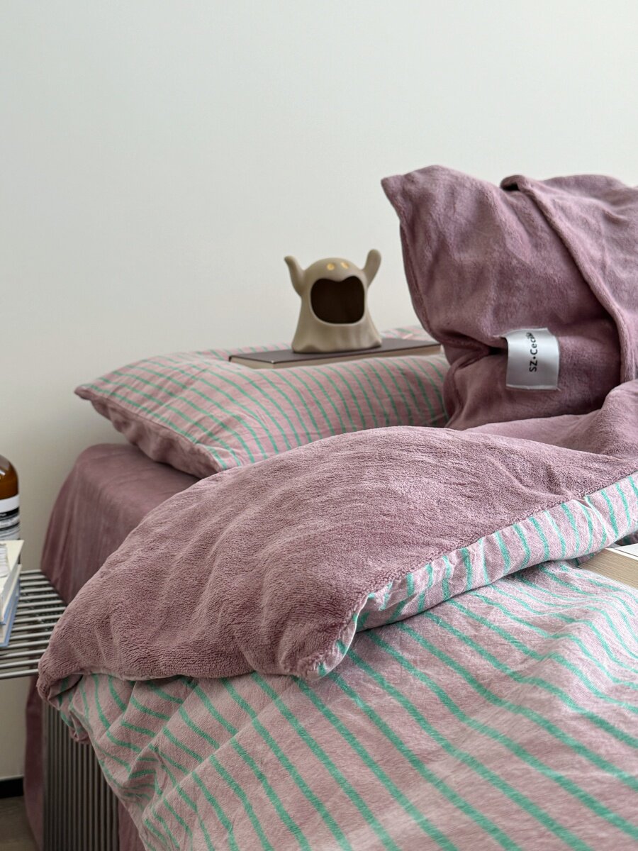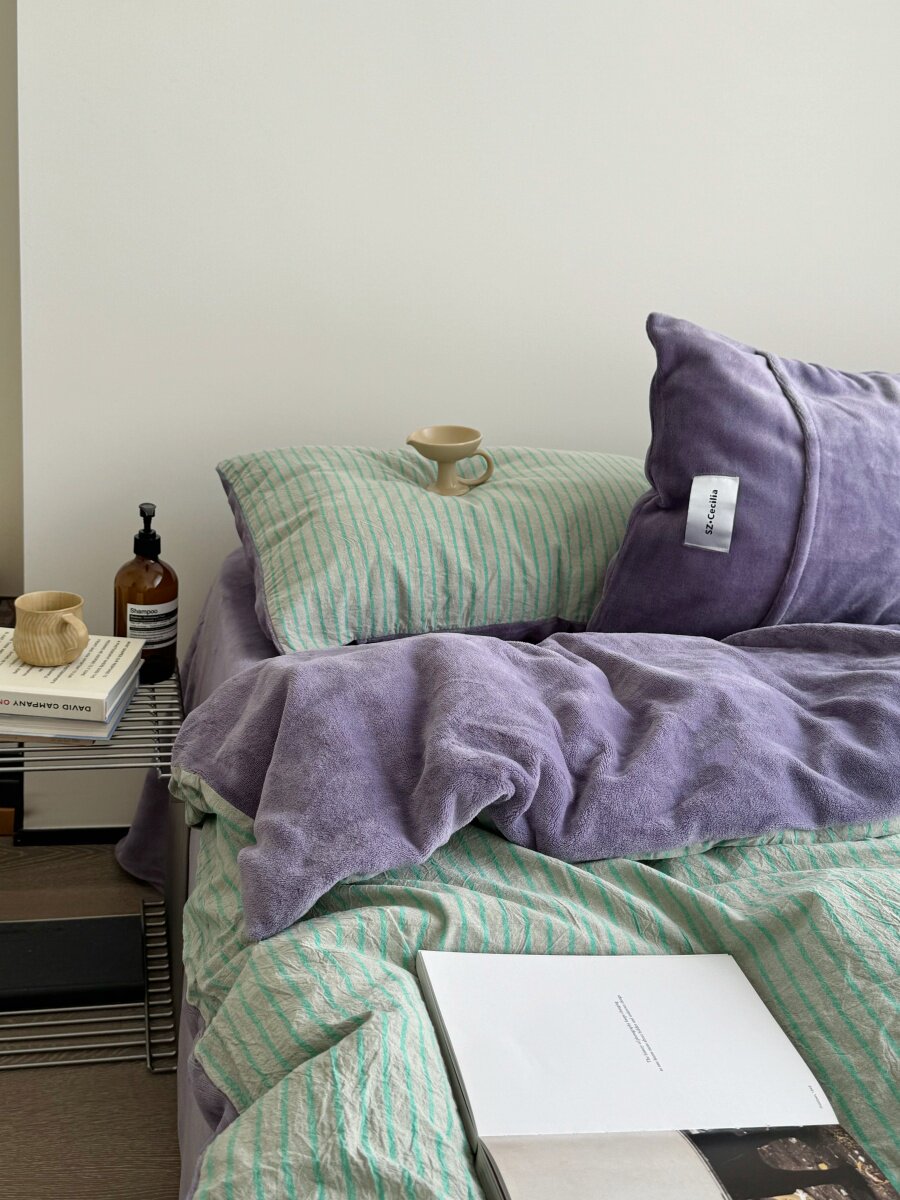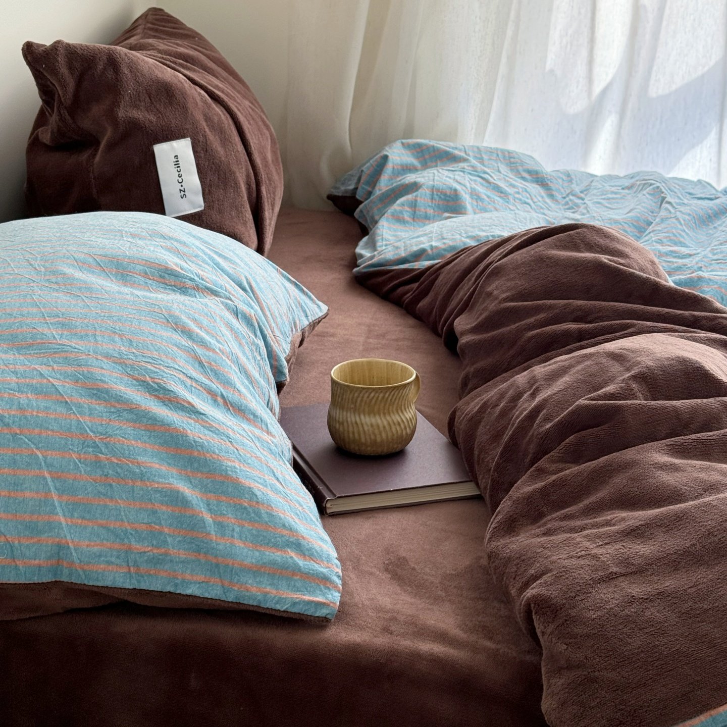 Retro Room|Ins Blogger Simple Blue and Coffee Color Striped Cotton Fleece Four-Piece Set 1.8 Milk Velvet Bed Sheet Fitted Sheet