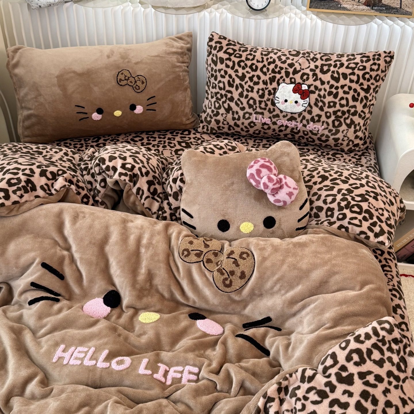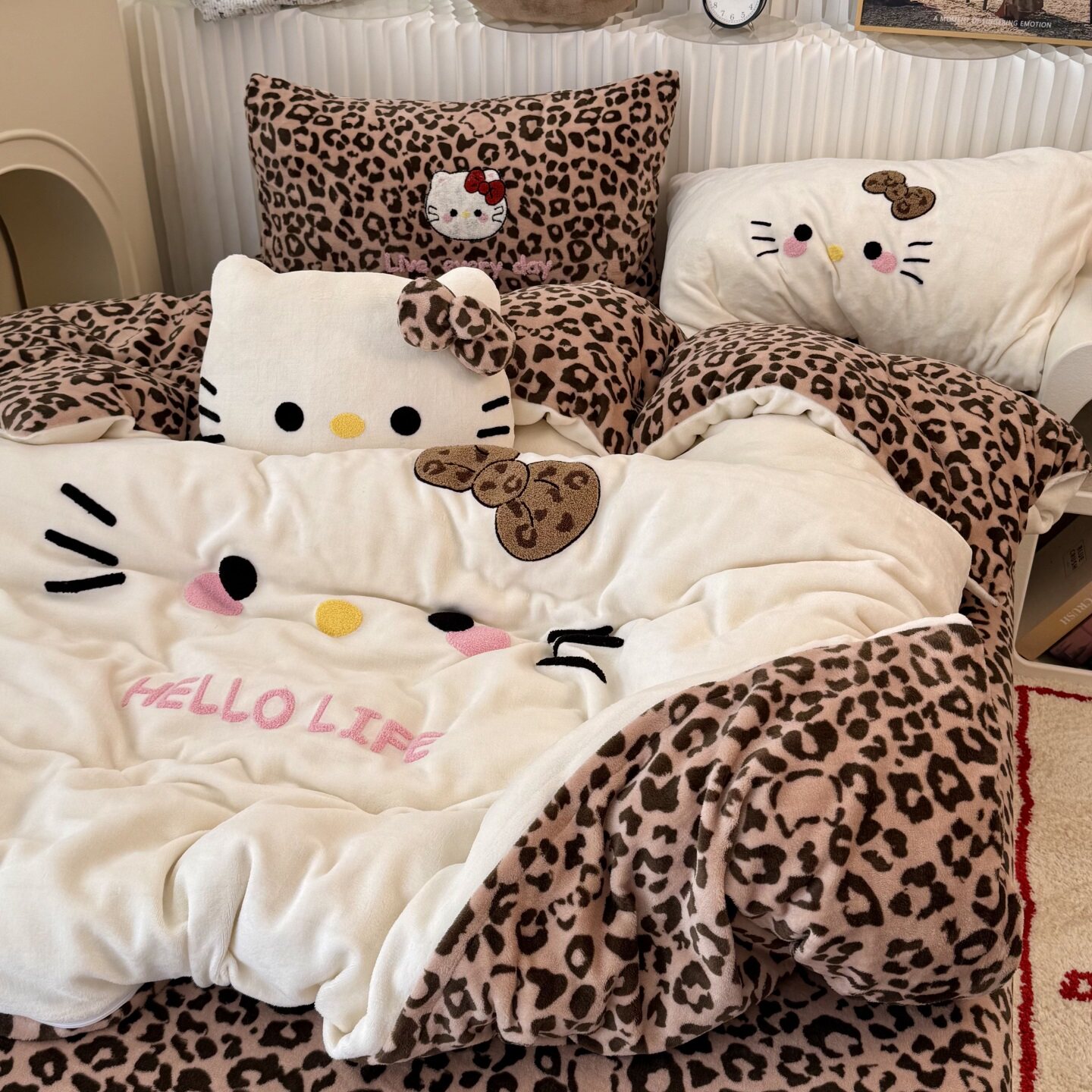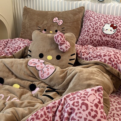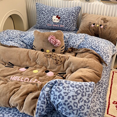 Cute Ins-Style Black Leather Kt Cat Towel Embroidery Milk Velvet Four-Piece Set, Winter Thickened Coral Velvet Three-Piece Fitted Sheet Set