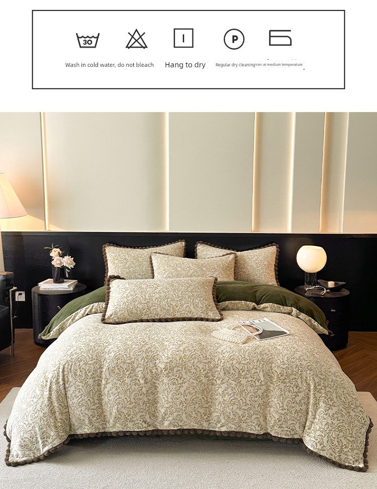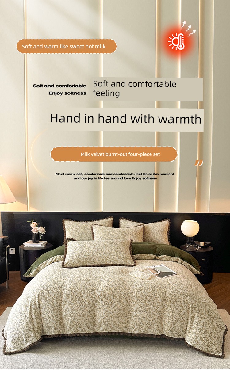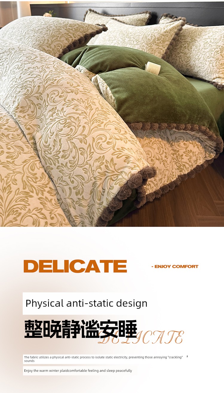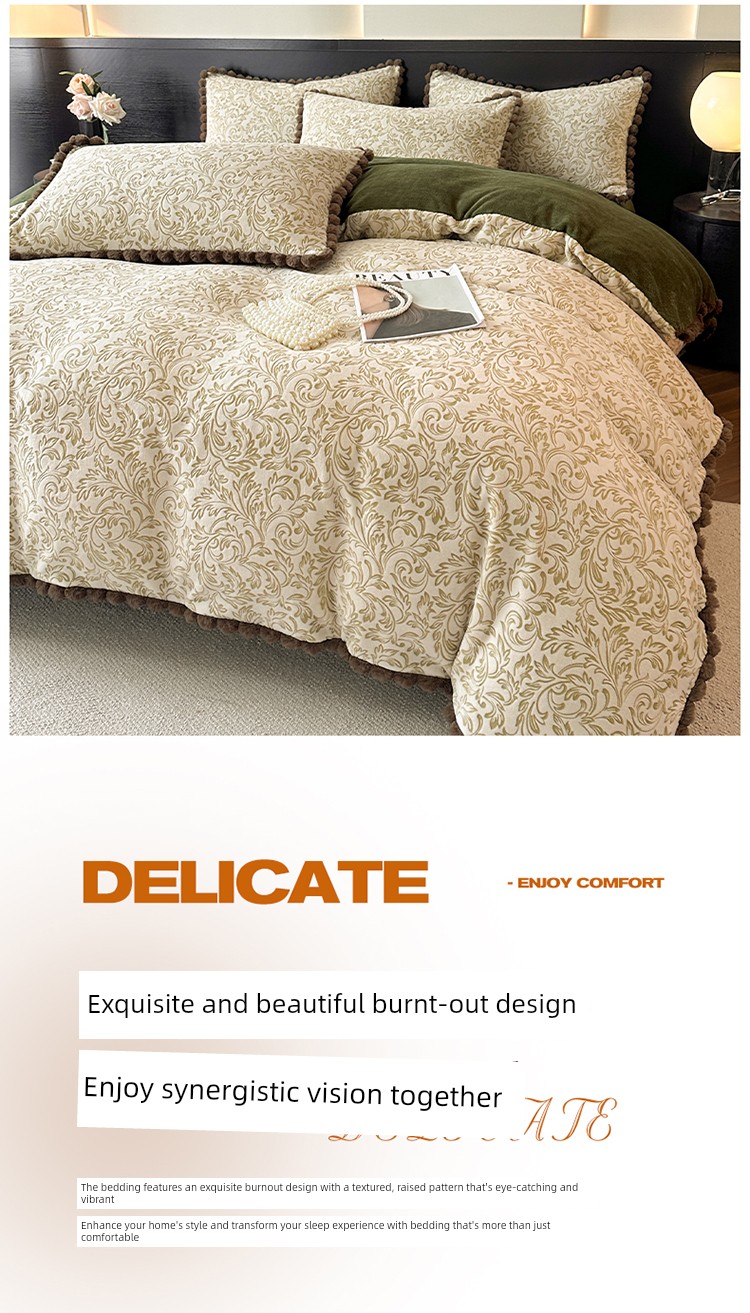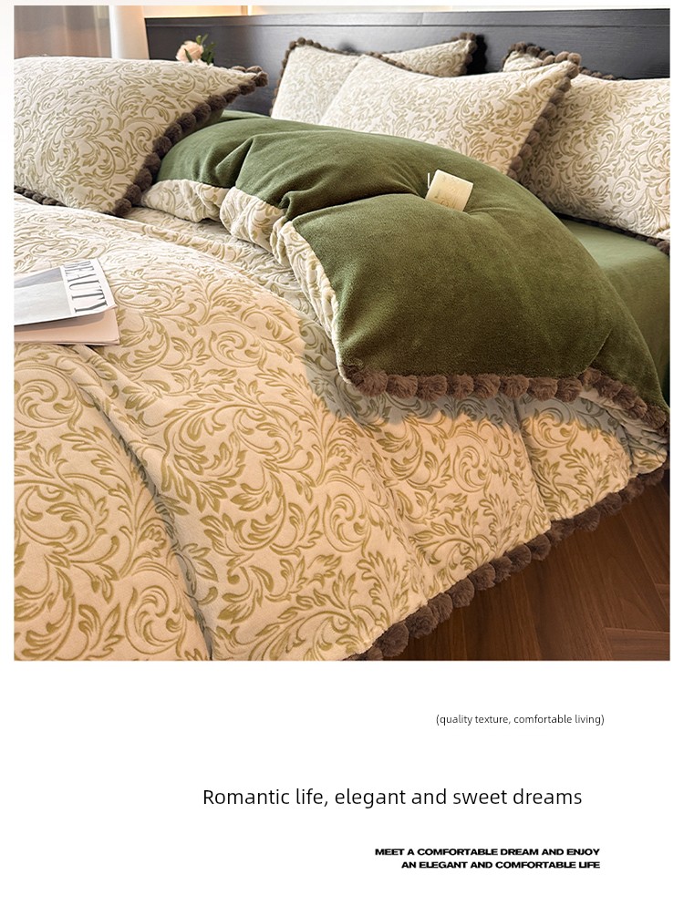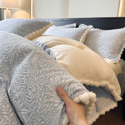 French-Style Rabbit Fur Ball Carved Milk Velvet Four-Piece Bedding Set for Winter, Coral Fleece Duvet Cover, Bed Sheet, Fitted Sheet, Three-Piece Set