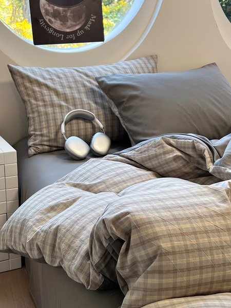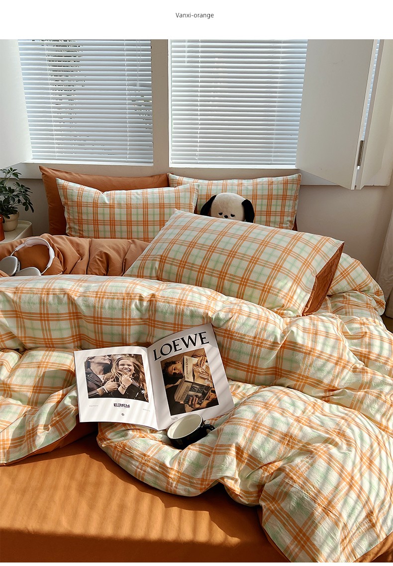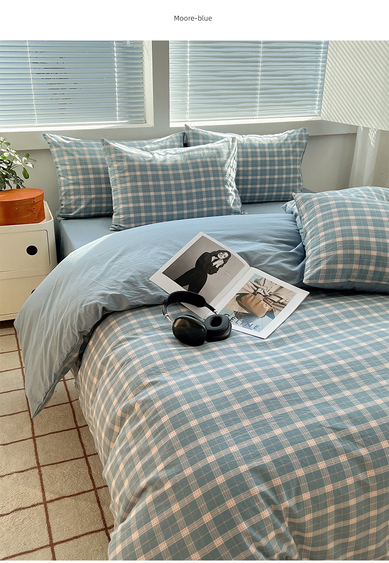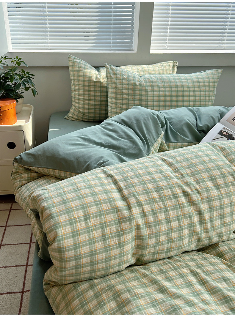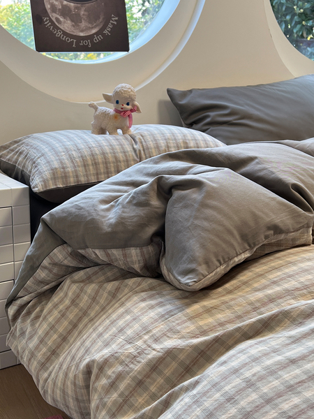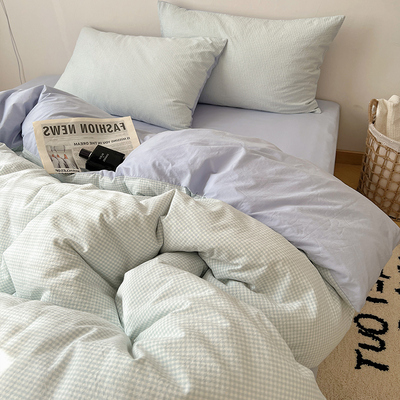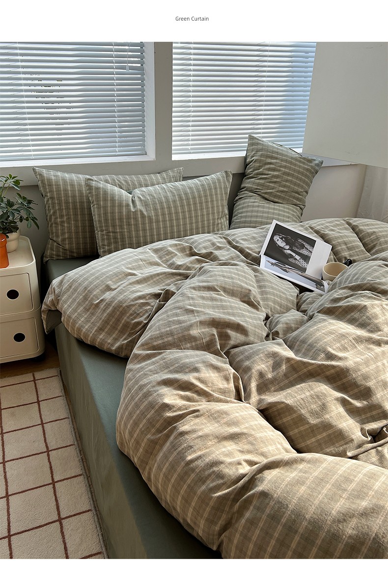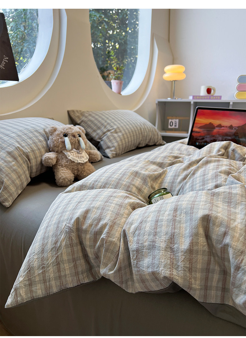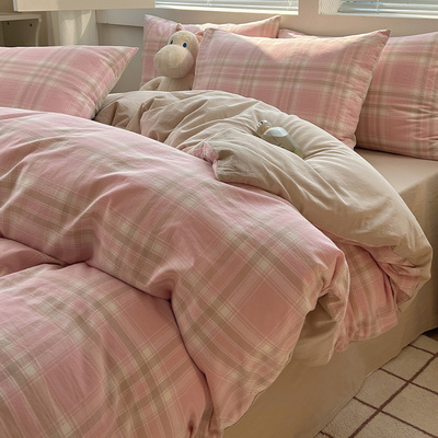 Simple Japanese-Style Gray Plaid Pure Cotton Washed Cotton Four-Piece Set Apartment Bed All-Cotton Duvet Cover Three-Piece Set 1.5m Home Use