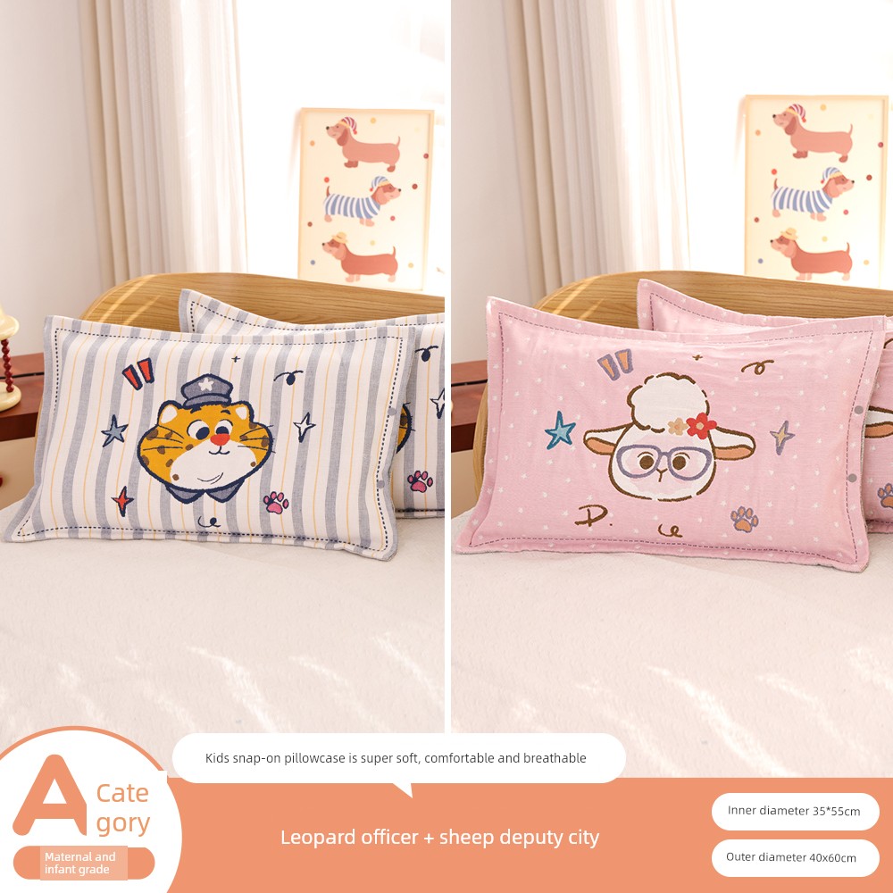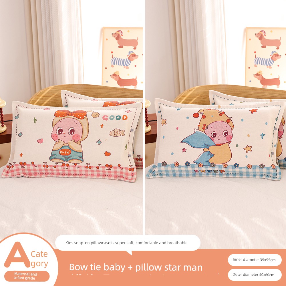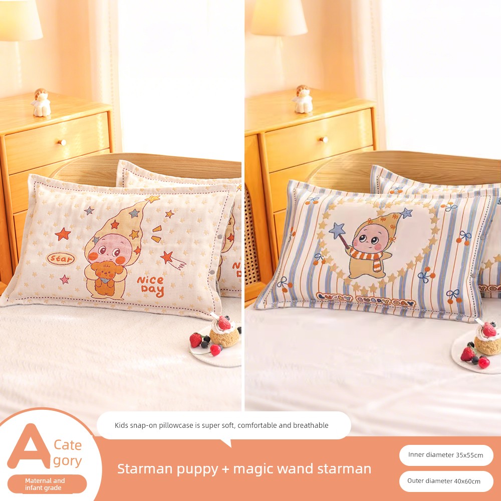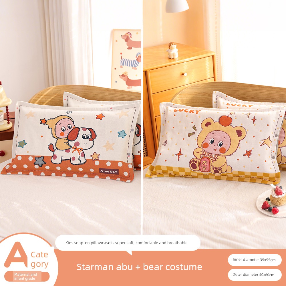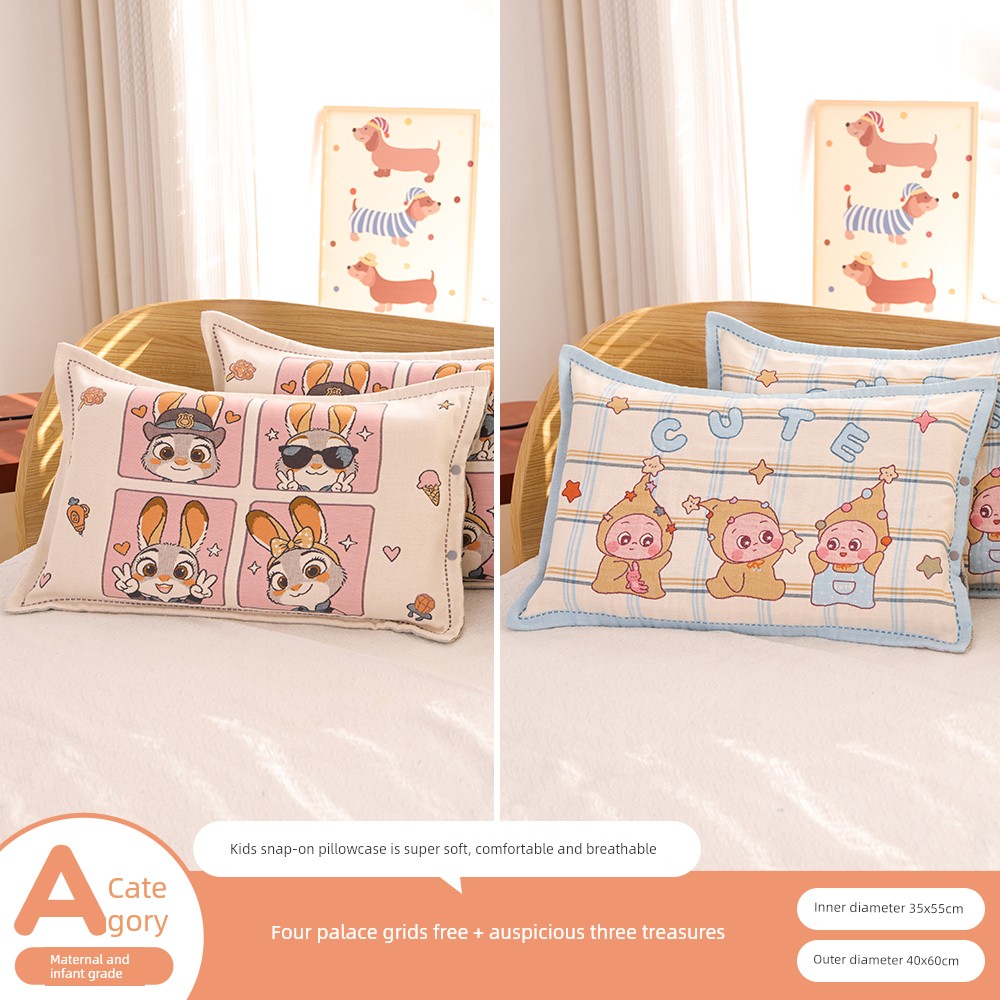Snap-Button Pure Cotton Gauze Cartoon Children's Pillowcase, All-Cotton, Fully Enclosed, Baby Home Use, Thickened, Soft Pillow Core Inner Cover