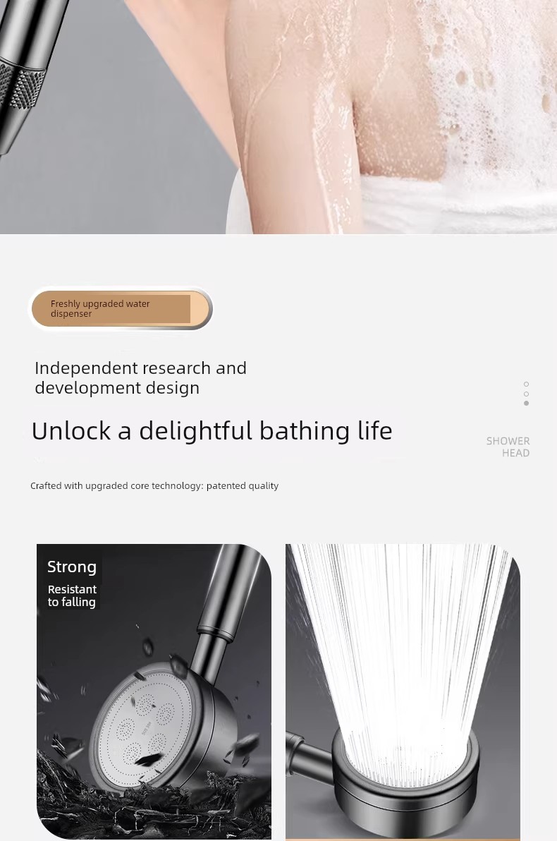 Obsidian Black Turbocharged Shower Head + Drill-Free Bracket + 1.5m Explosion-Proof Hose