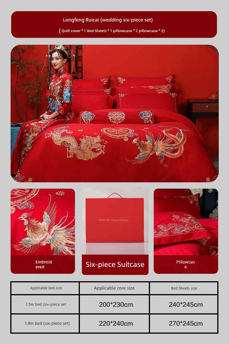 Dragon and Phoenix Ruicai Set Three [Eight Sets for Wedding: Four-Piece Wedding Set (Sheet*1+Quilt Cover*1+Pillowcase*2)+Goose down Quilt+Silk Quilt+Pillow Core+Blanket+Pillow Core]