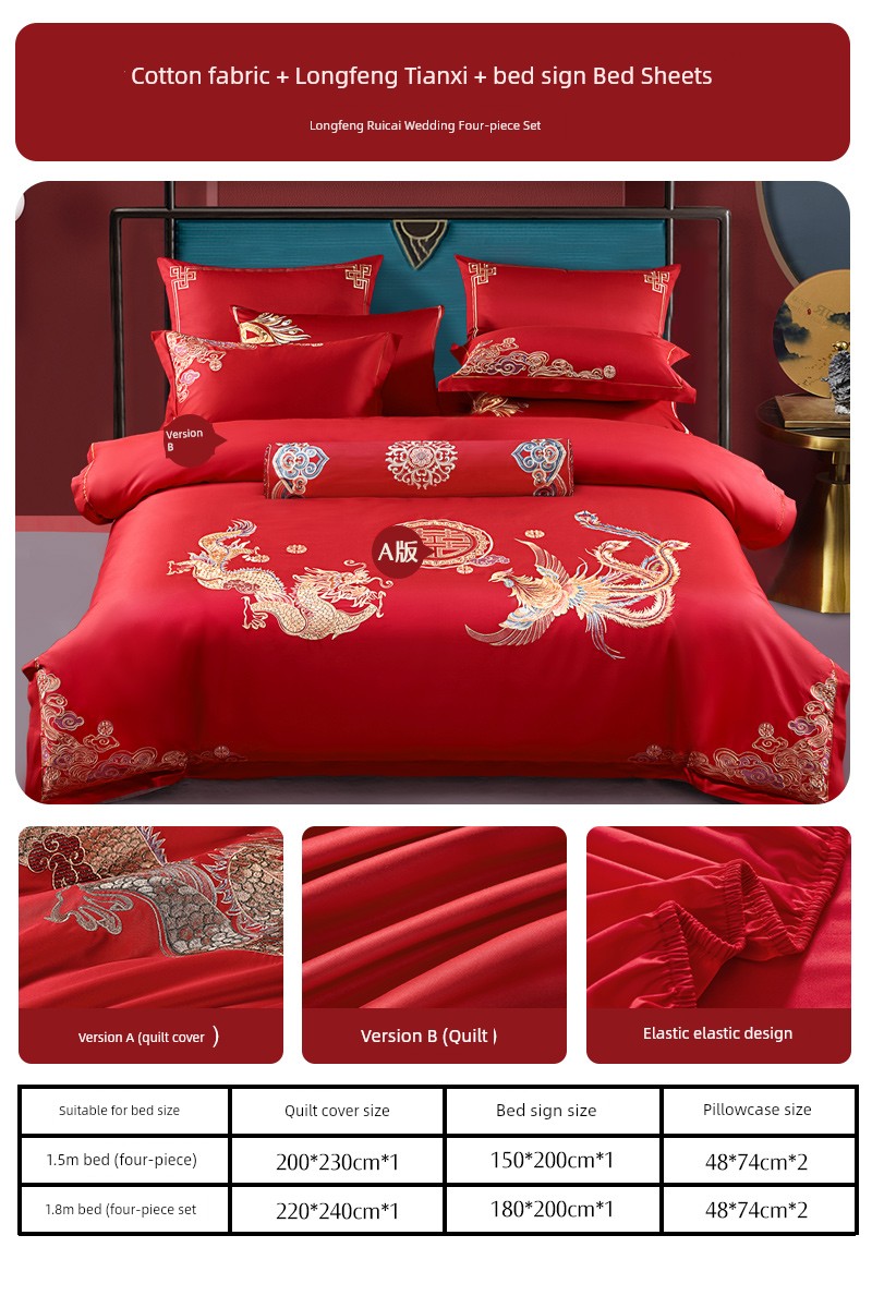 Main Image Style☆Four-Piece Set [Cotton Fabric + Exquisite Embroidery] Dragon and Phoenix Ruicai