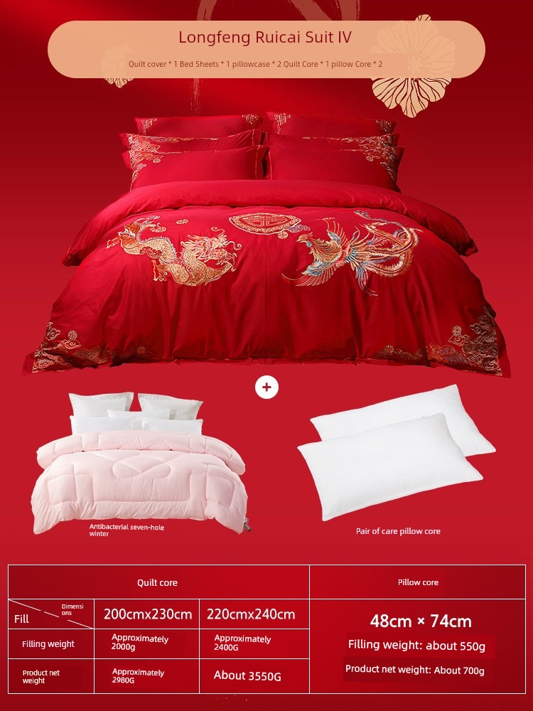 Dragon and Phoenix Ruicai Set Four [Four-Piece Wedding Set + Fiber Quilt + Pillow Core]