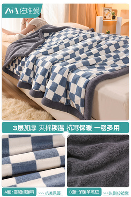 羊羔绒-棋盘格-蓝灰【✅A类母婴级 3层加厚 保暖抗寒】