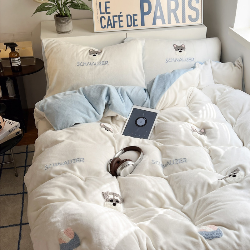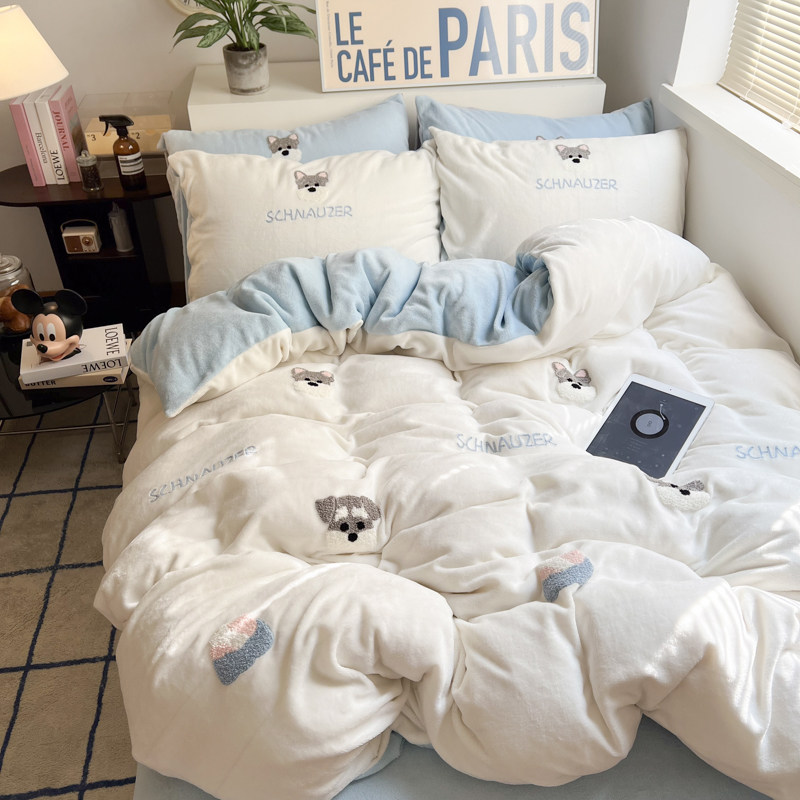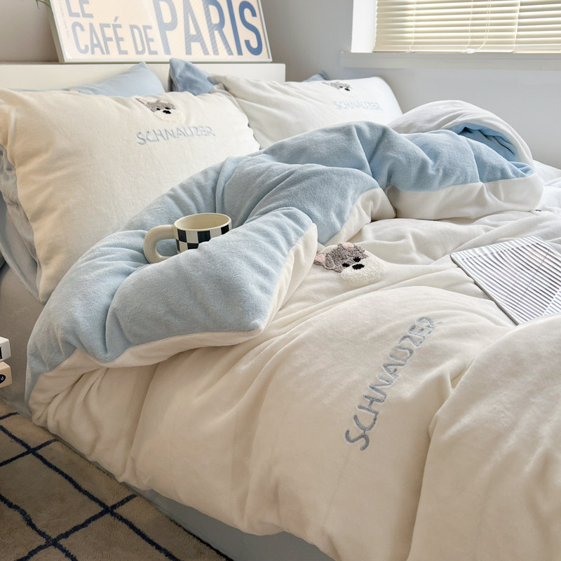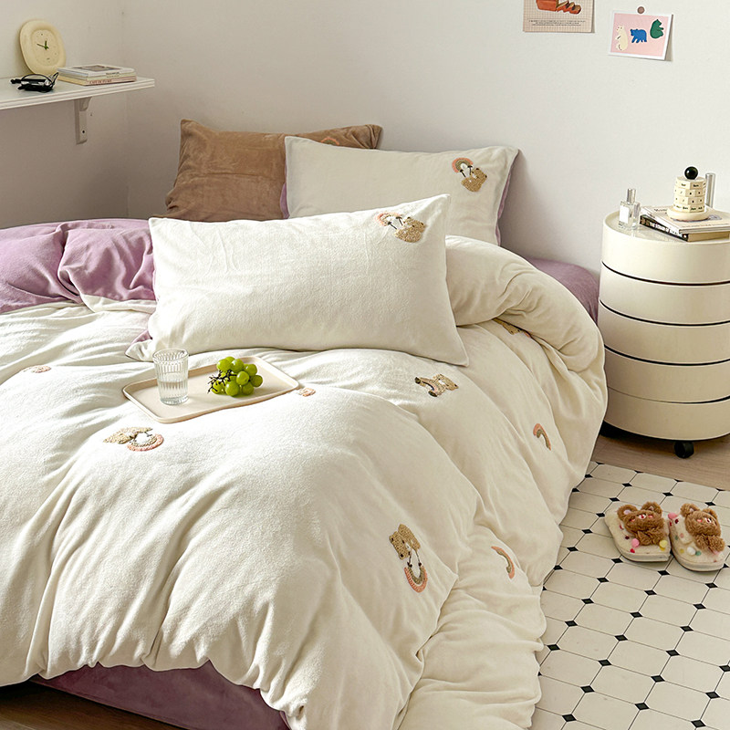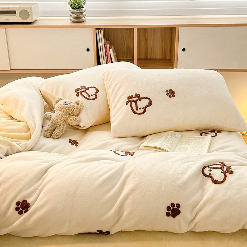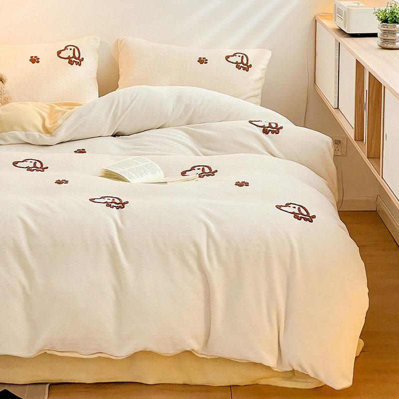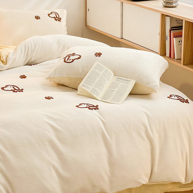 A类加厚保暖毛巾绣牛奶绒四件套珊瑚被套三件冬季1.8m床单笠用品