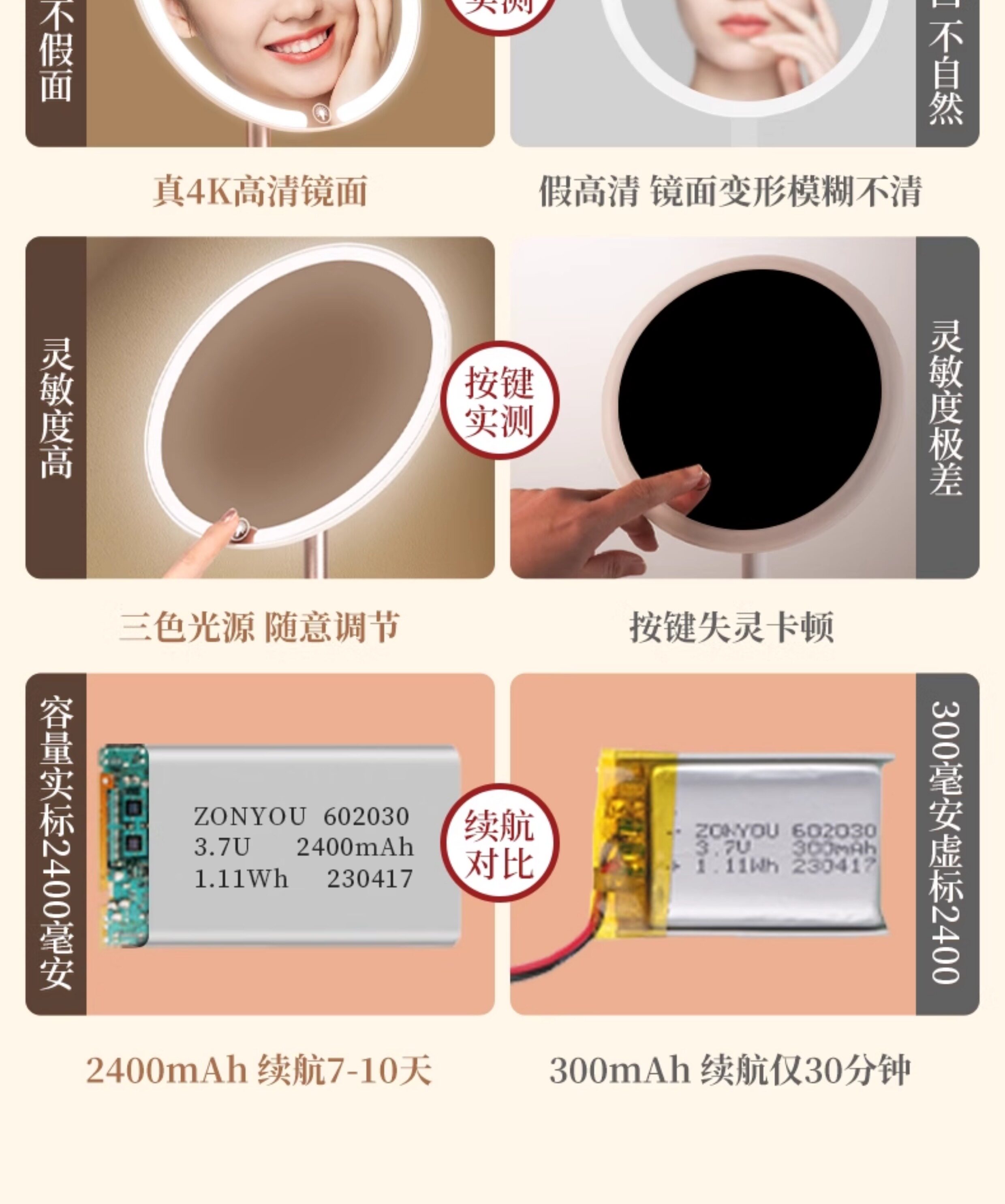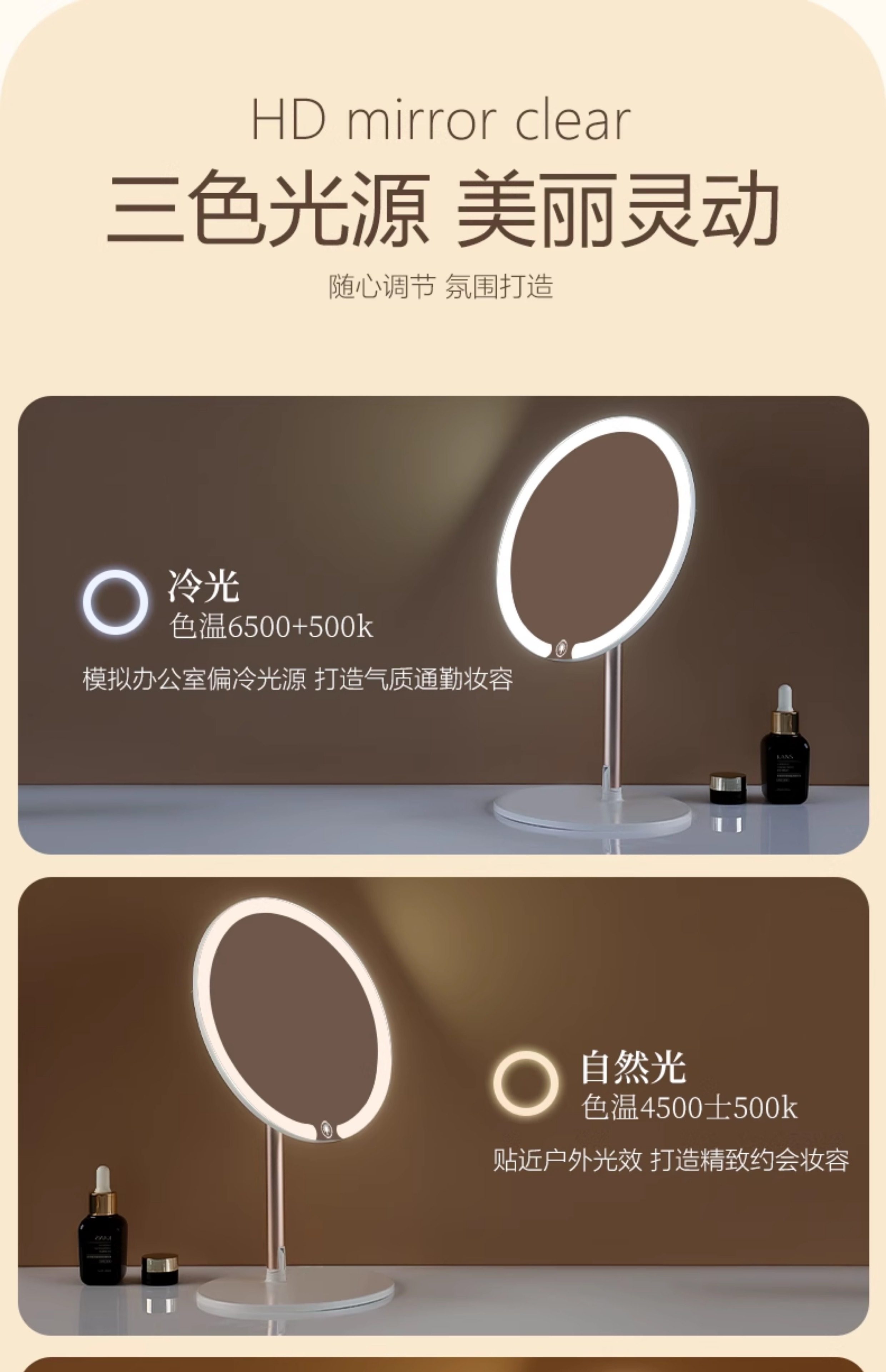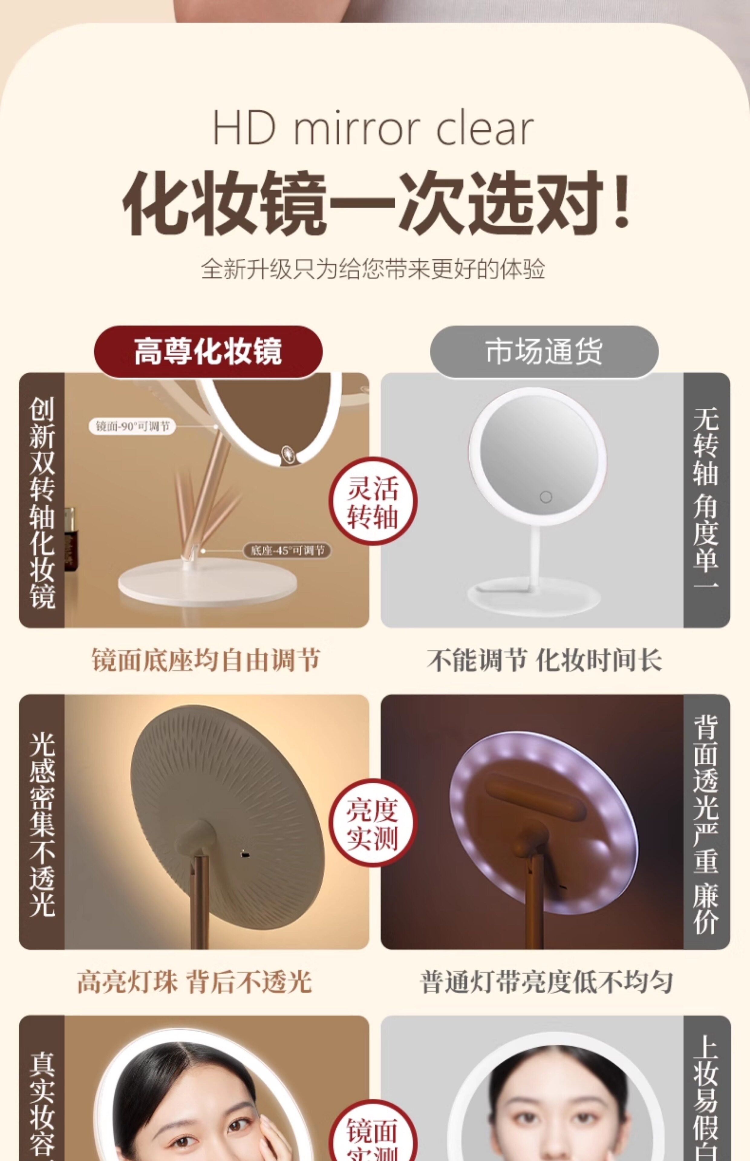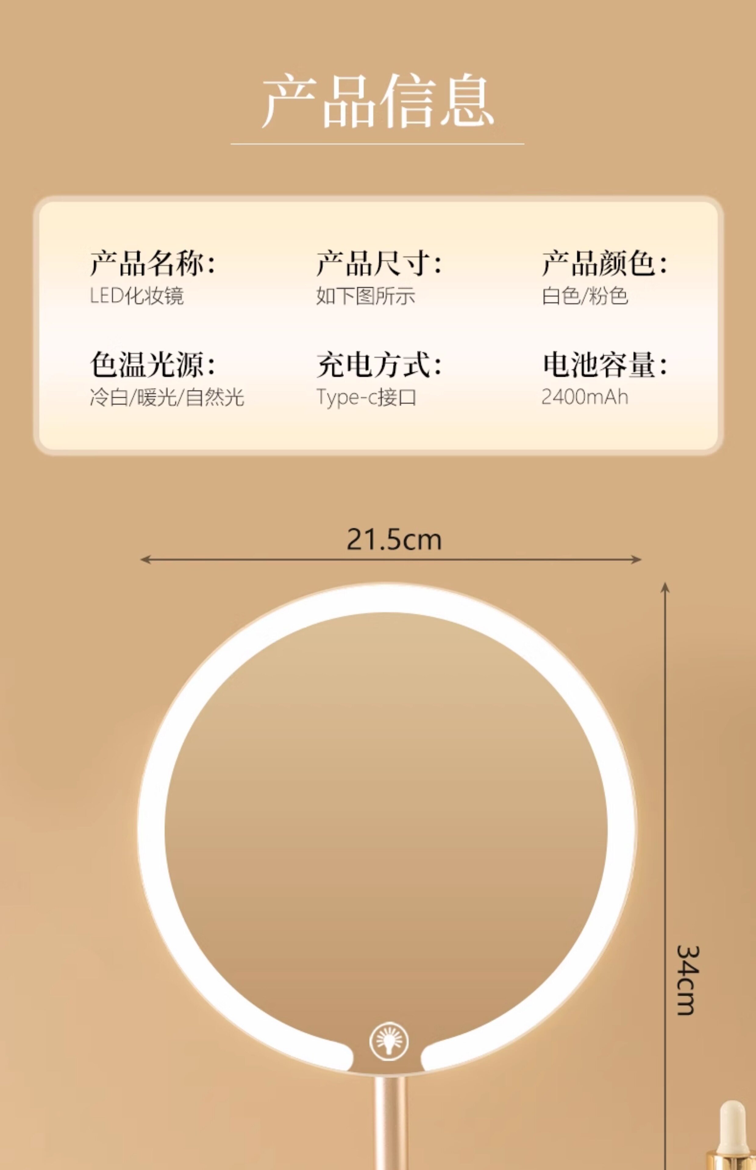 双轴化妆镜带灯台式桌面学生宿舍led梳妆镜折叠便携充电补光镜子