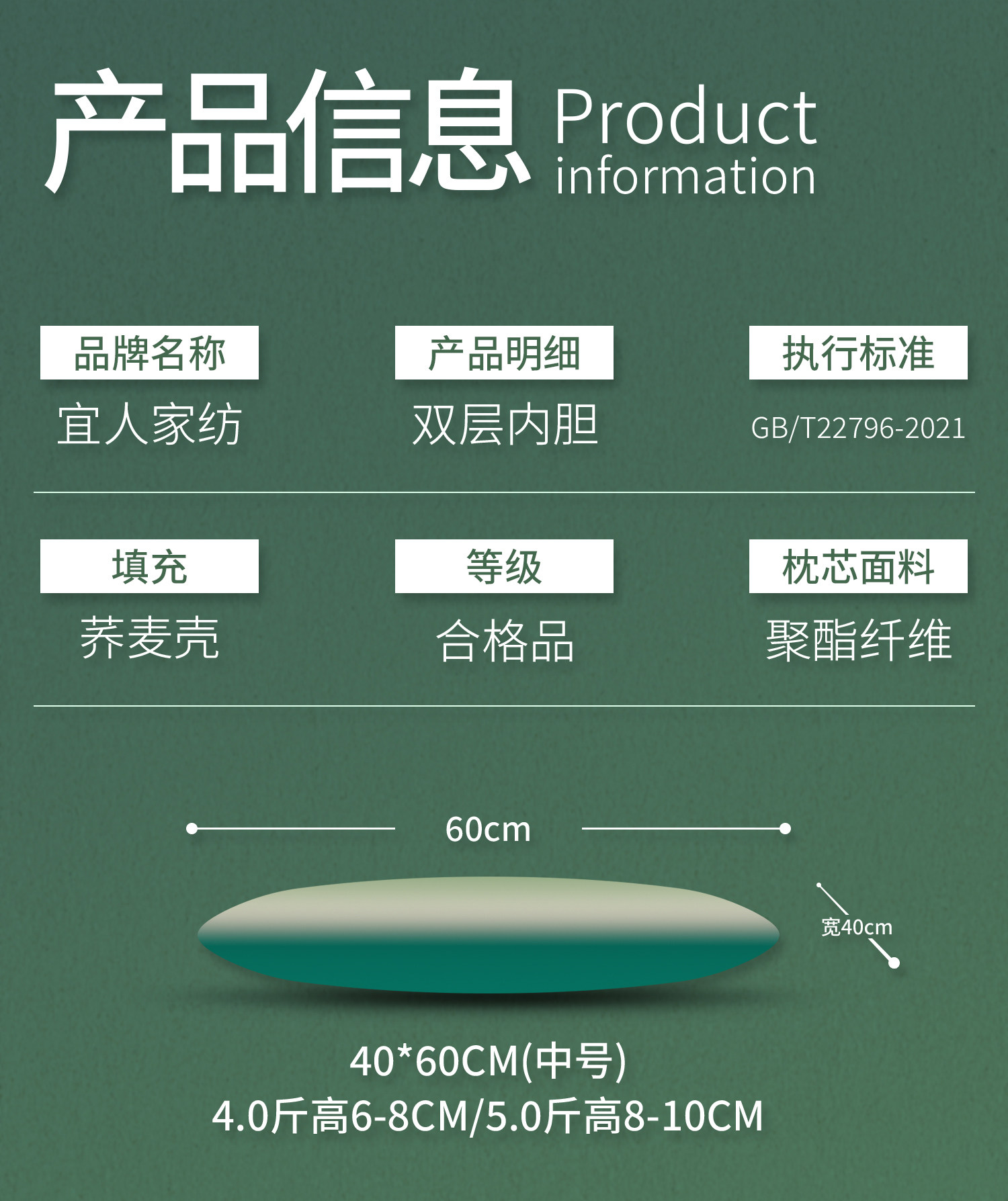 40*60cm【中号低枕4.0斤装-双层内胆】 无枕套 90级荞麦壳