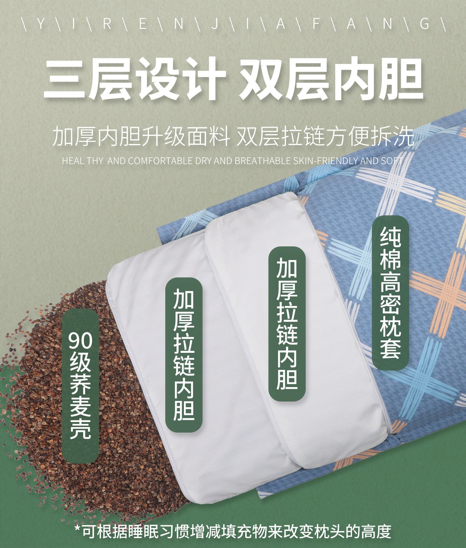 悠若花懿【中号高枕5.0斤装】双层内胆+纯棉枕套 90级荞麦壳