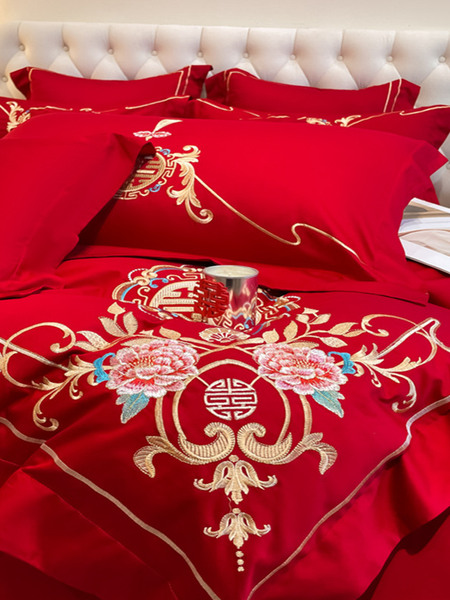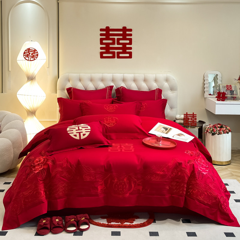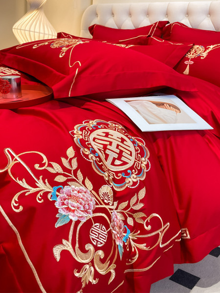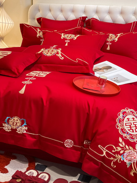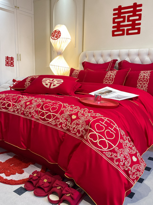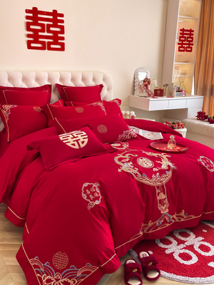 高档中式结婚四件套大红色婚庆纯棉被套婚房喜被新婚陪嫁床上用品