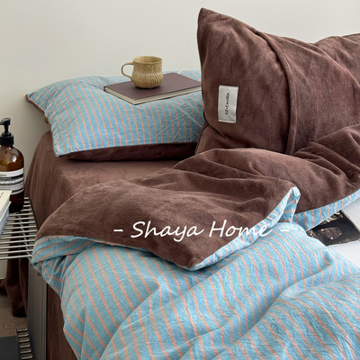 棉+绒蓝咖条【A面全棉水洗棉 B面保暖牛奶绒】