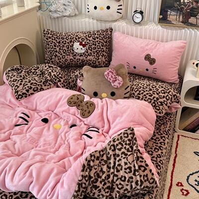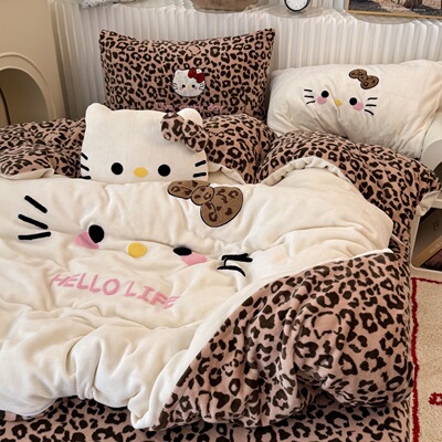 可爱ins黑皮KT猫咪毛巾绣牛奶绒四件套冬天加厚珊瑚绒三件套床笠