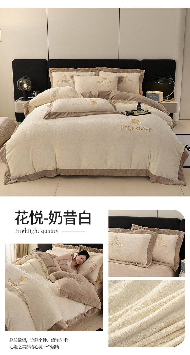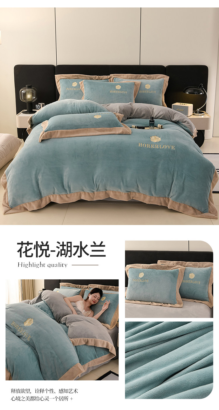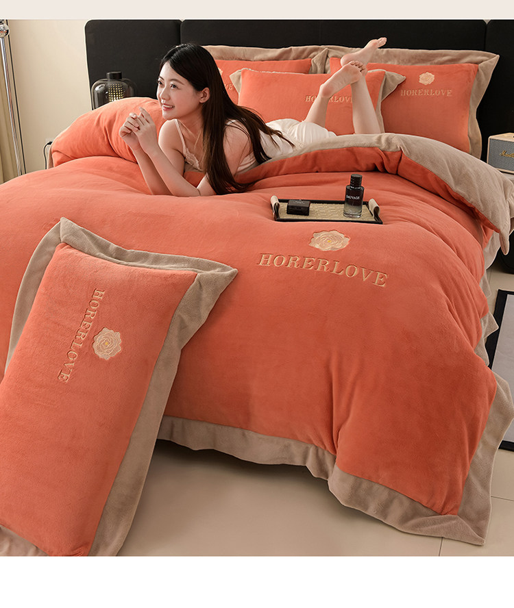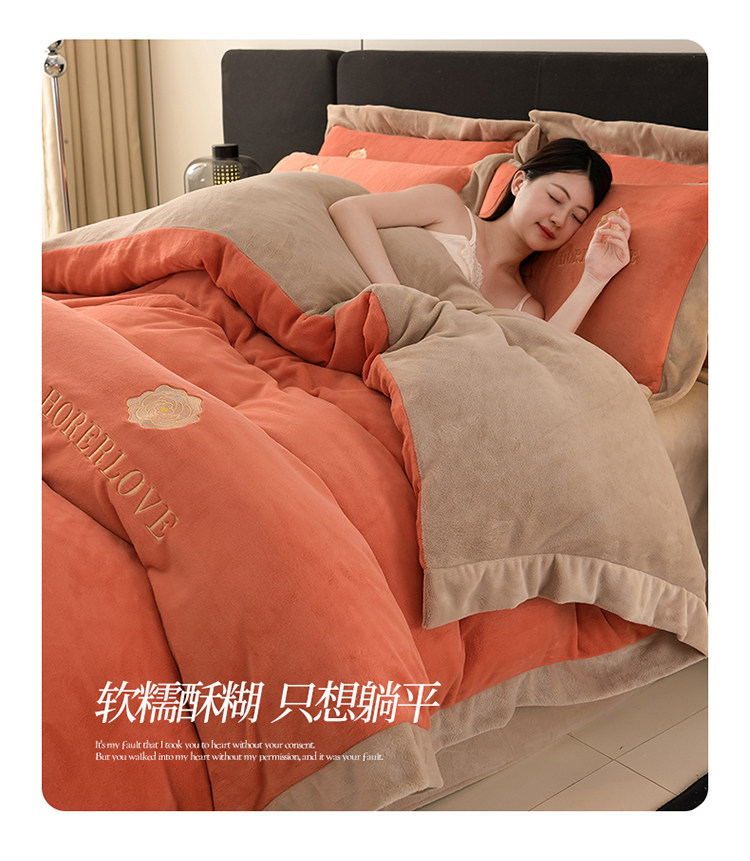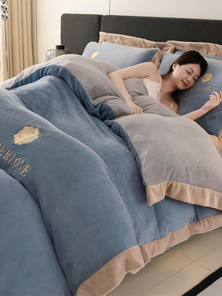 水星家纺秋冬季加厚牛奶绒四件套保暖绒绣花刺绣法莱绒被套床笠款