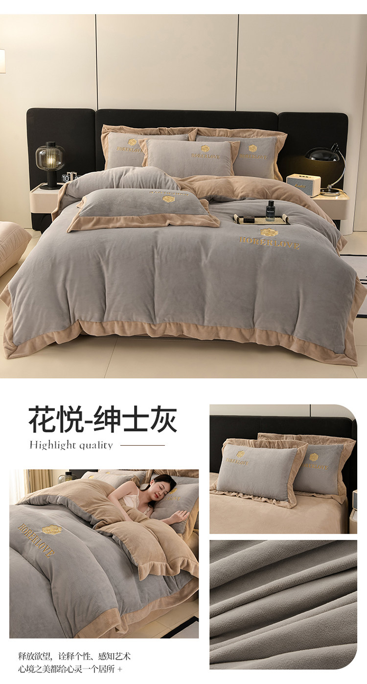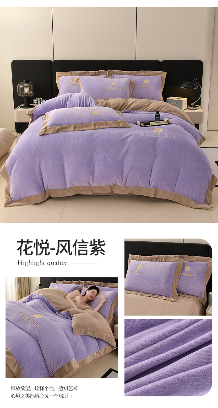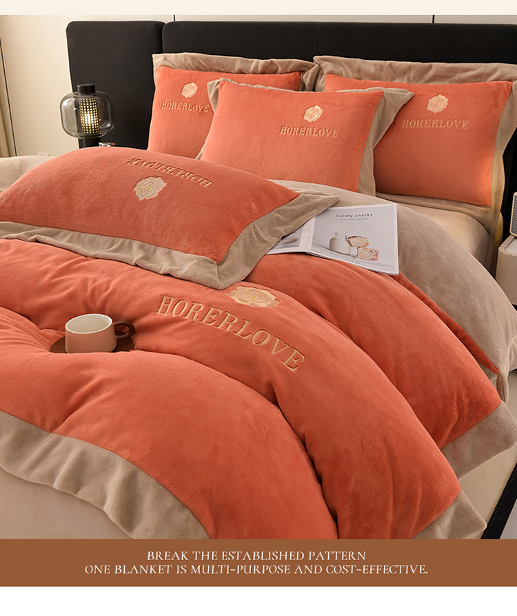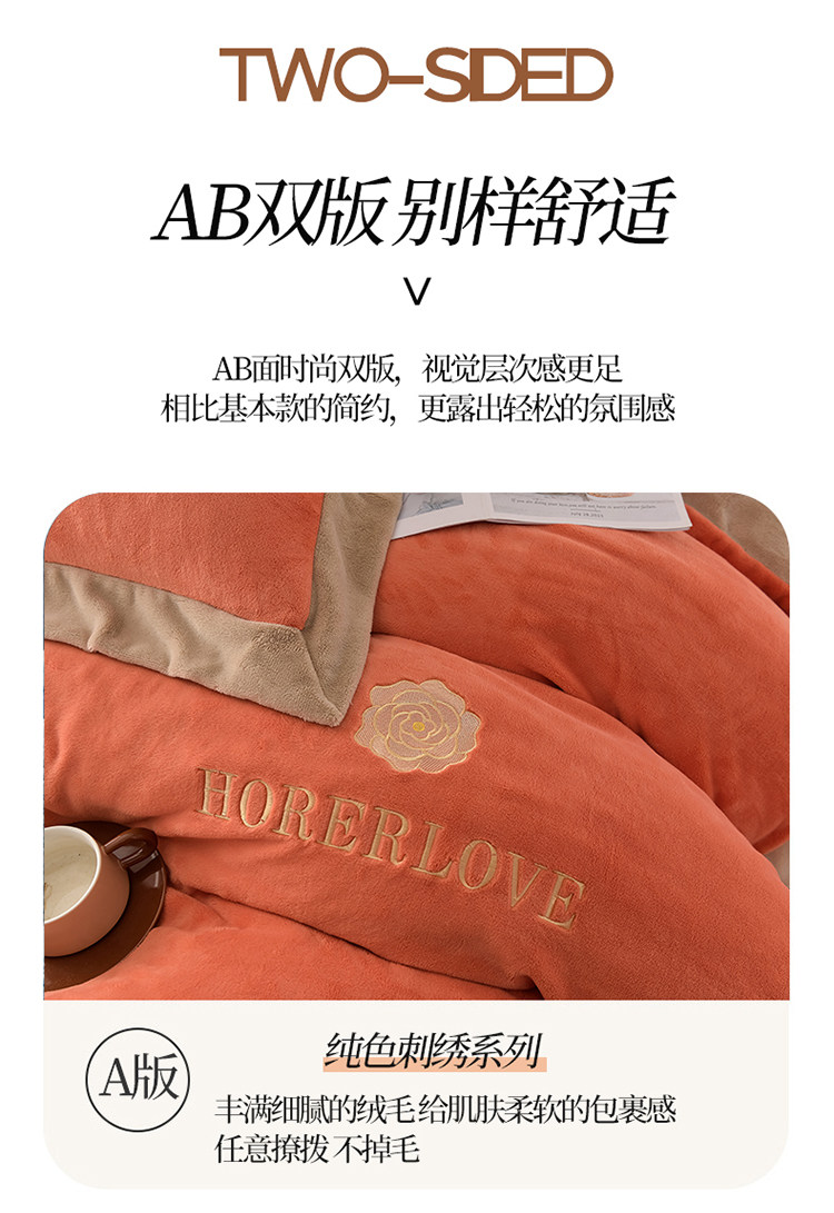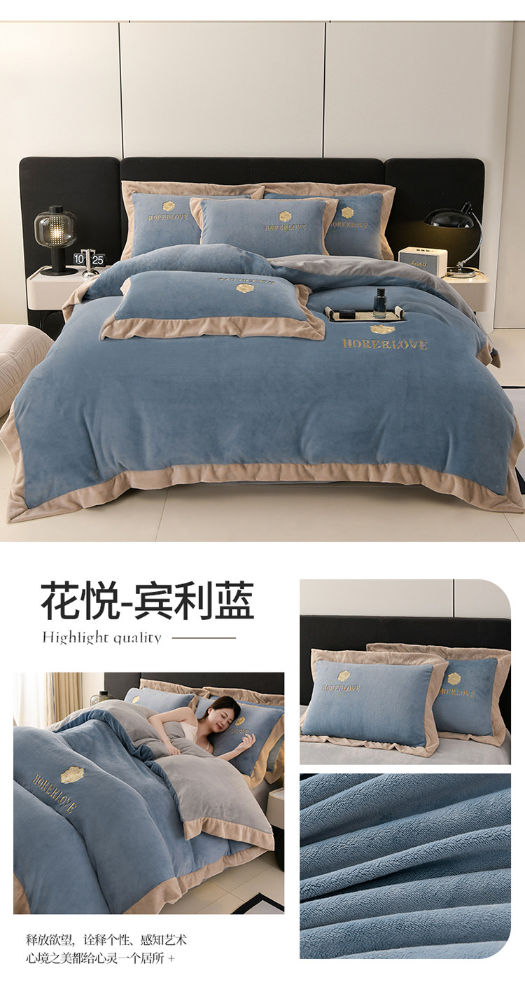 水星家纺秋冬季加厚牛奶绒四件套保暖绒绣花刺绣法莱绒被套床笠款
