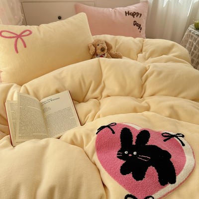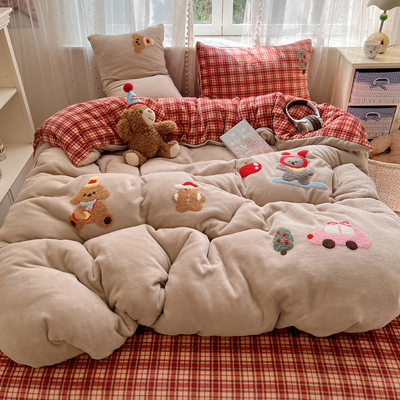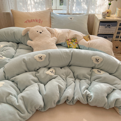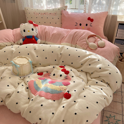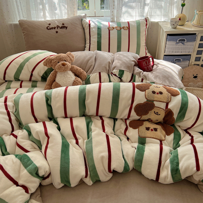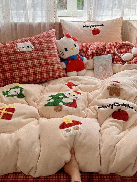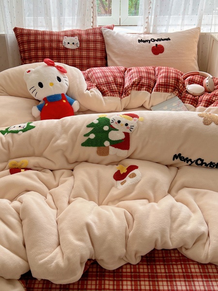 圣诞猫咪毛巾绣牛奶绒四件套秋冬保暖双面绒珊瑚绒被套软糯床单