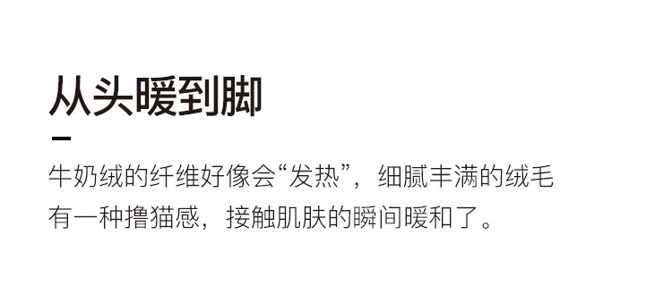 “发热纤维” 从头暖到脚。考虑到B面直接接触肌肤,特意升極→230g牛奶绒,绒毛更长更密更柔软,躺下瞬间就暖和起来了