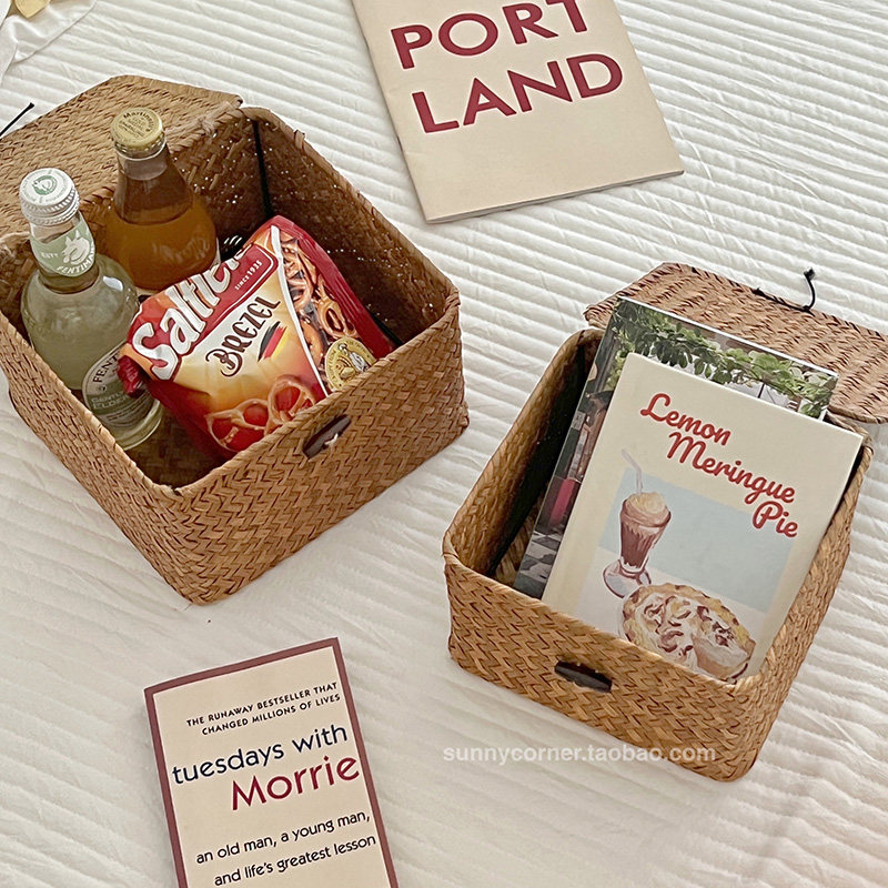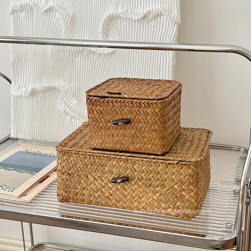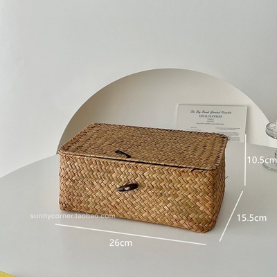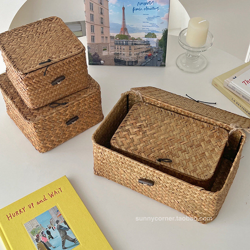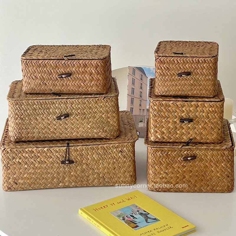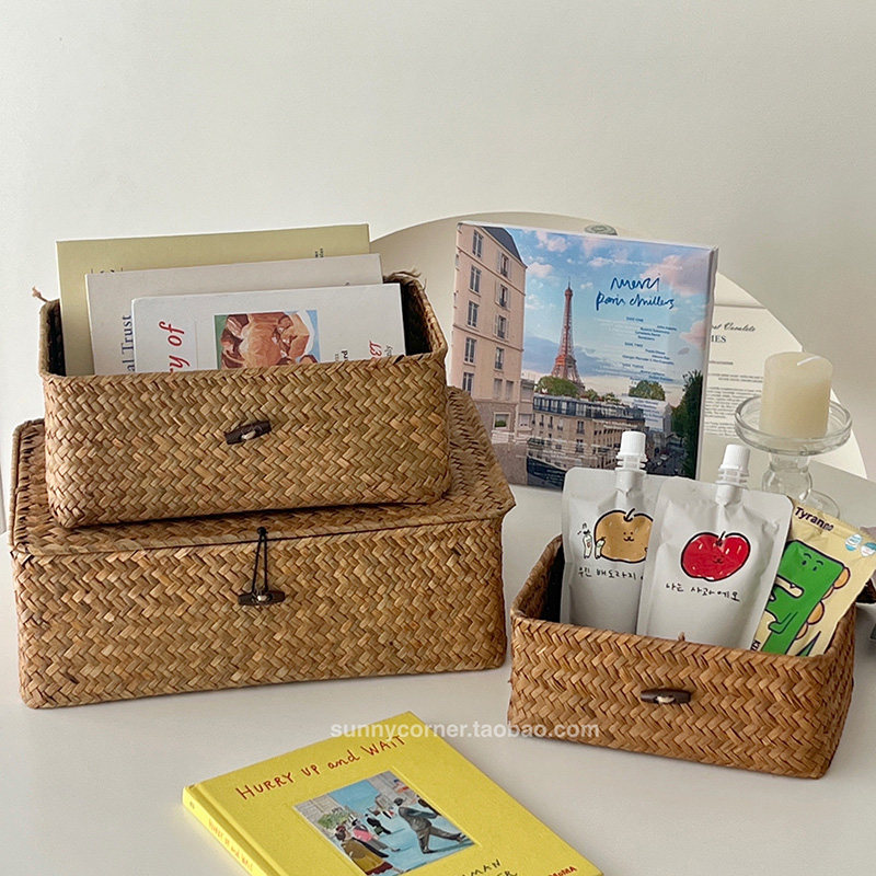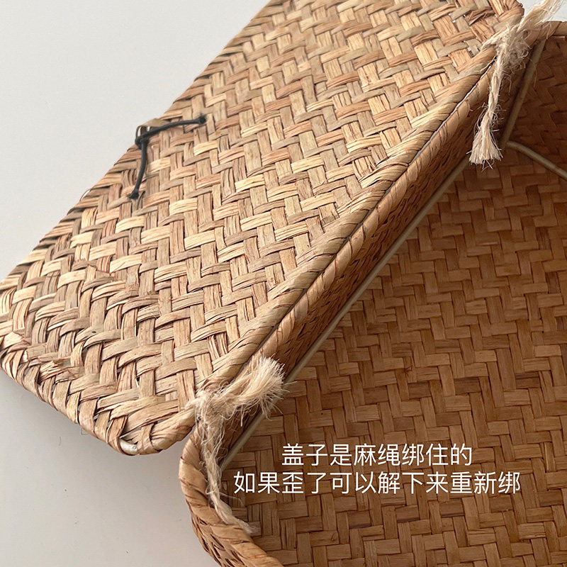 ins风日式桌面收纳盒手工编织茶几零食杂物收纳筐草编带盖收纳篮