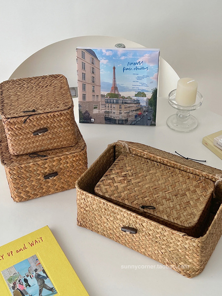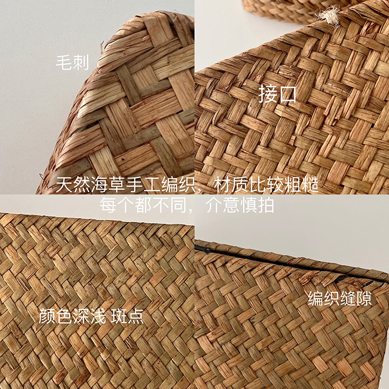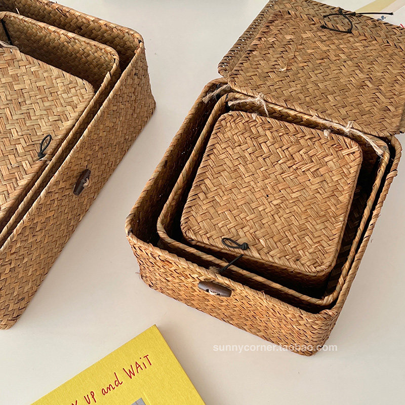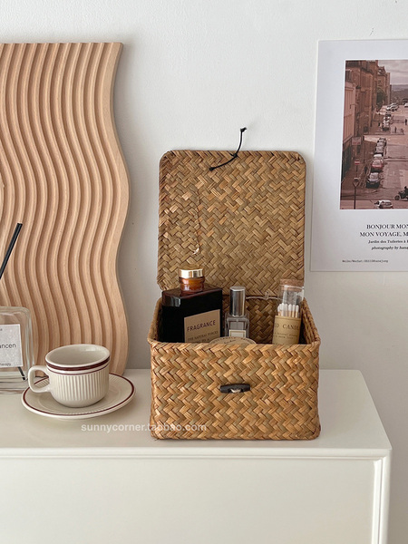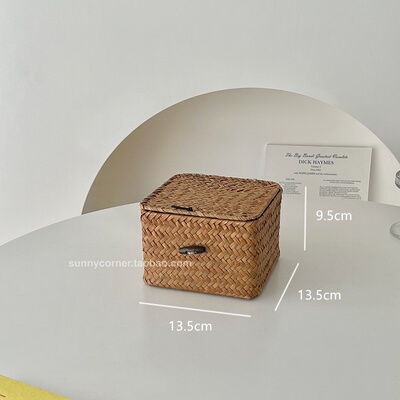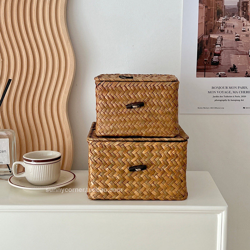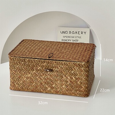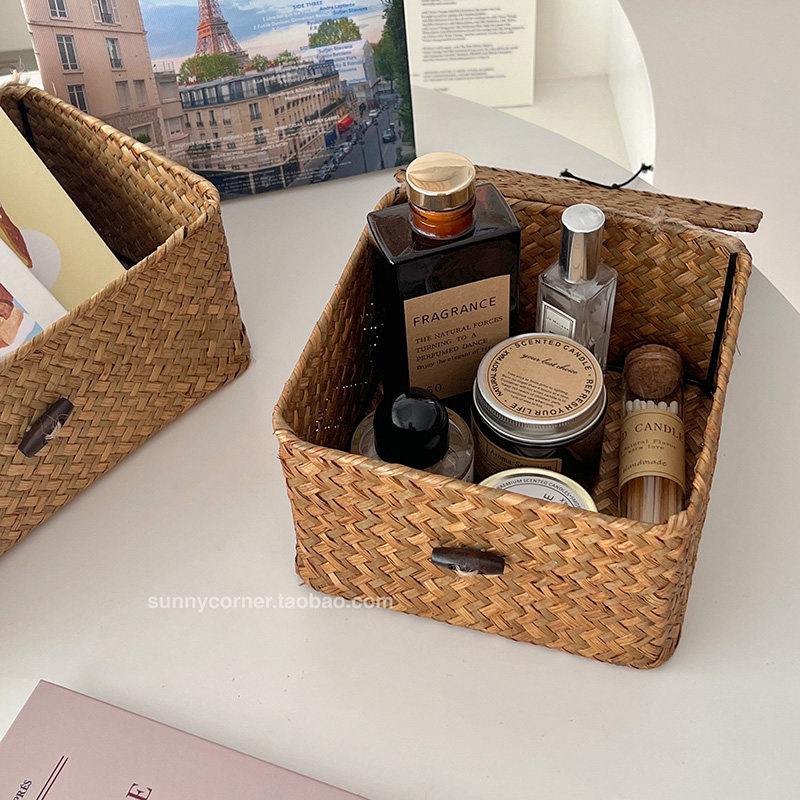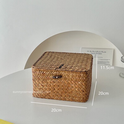 ins风日式桌面收纳盒手工编织茶几零食杂物收纳筐草编带盖收纳篮